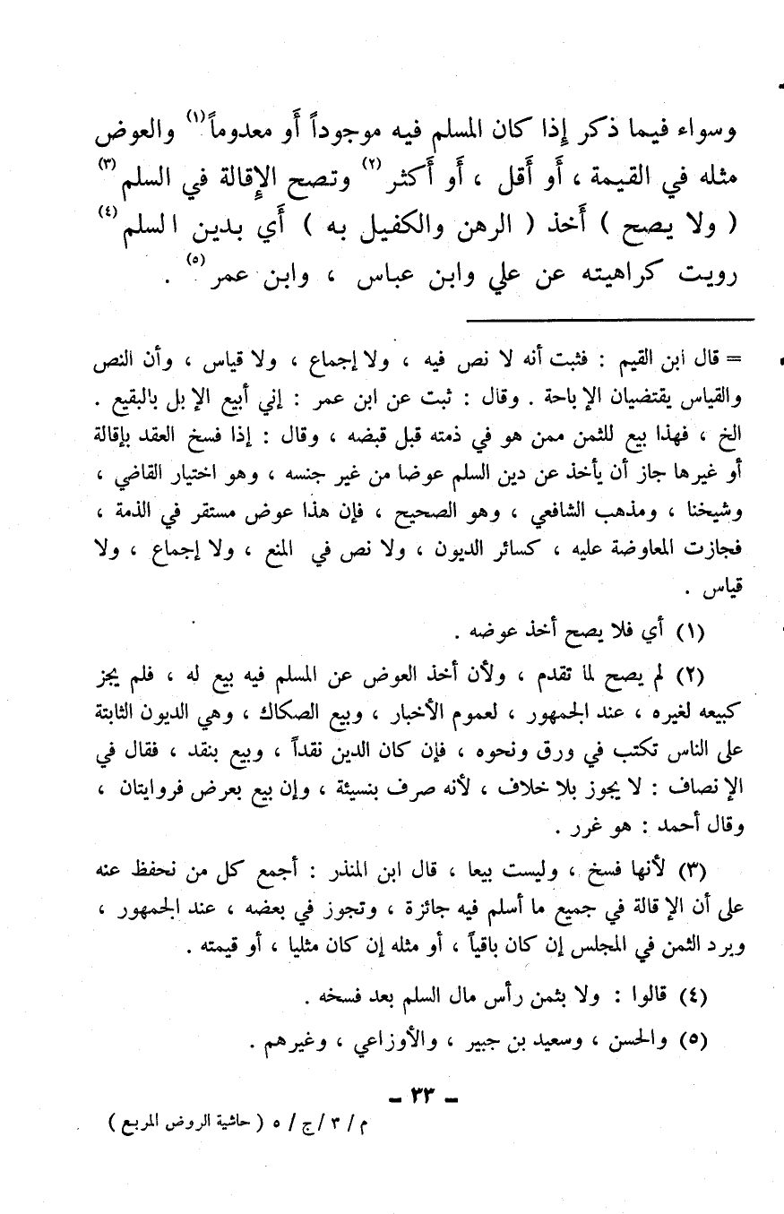 وسواء فيما ذكر إذا كان المسلم فيه موجودًا أو معدومًا (¬1) والعوض مثله في القيمة، أو أقل، أو أكثر (¬2) وتصح الإقالة في السلم (¬3) (ولا يصح) أخذ (الرهن والكفيل به) أي بدين السلم (¬4) رويت كراهيته عن علي وابن عباس، وابن عمر (¬5) .