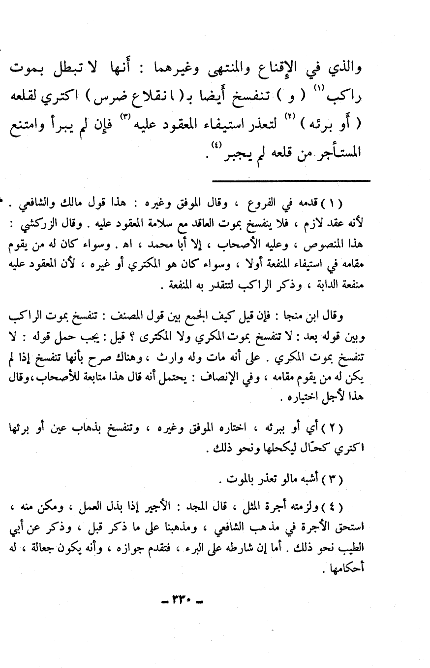 وقال ابن منجا: فإن قيل كيف الجمع بين قول المصنف: تنفسخ بموت الراكب وبين قوله بعد: لا تنفسخ بموت المكري ولا المكترى؟ قيل: يجب حمل قوله: لا تنفسخ بموت المكري. على أنه مات وله وارث، وهناك صرح بأنها تنفسخ إذا لم يكن له من يقوم مقامه، وفي الإنصاف: يحتمل أنه قال هذا متابعة للأصحاب، وقال هذا لأجل اختياره.