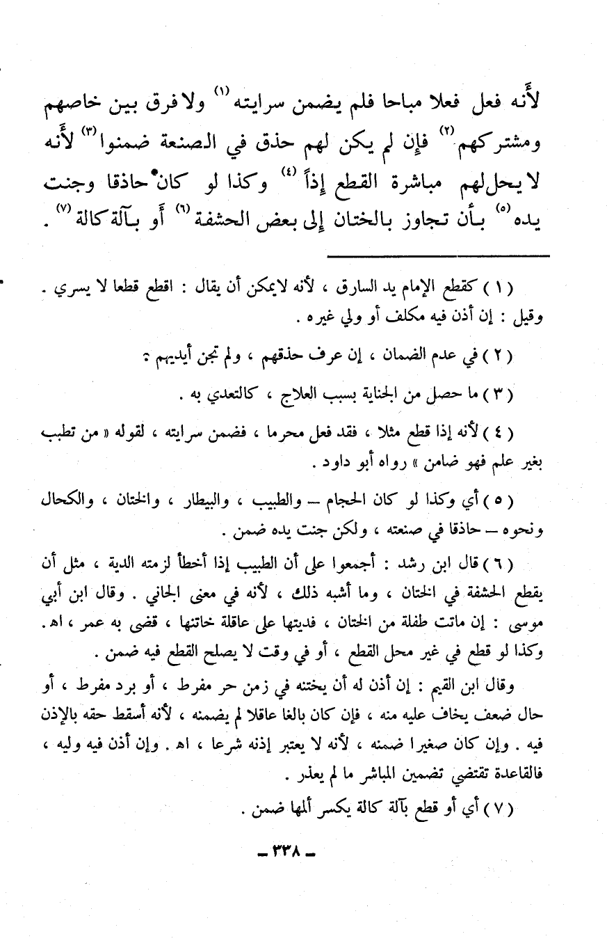 (¬6) قال ابن رشد: أجمعوا على أن الطبيب إذا أخطأ لزمته الدية، مثل أن يقطع الحشفة في الختان، وما أشبه ذلك، لأنه في معنى الجاني. وقال ابن أبي موسى: إن ماتت طفلة من الختان، فديتها على عاقلة خاتنها، قضى به عمر. اهـ. وكذا لو قطع في غير محل القطع، أو في وقت لا يصلح القطع فيه ضمن.