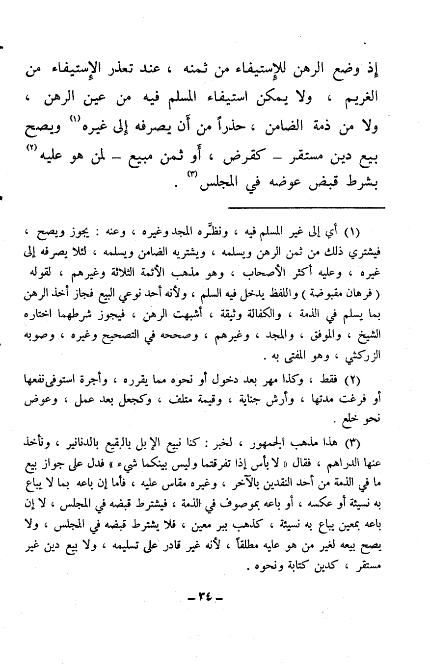 (¬3) هذا مذهب الجمهور، لخبر: كنا نبيع الإبل بالبقيع بالدنانير، ونأخذ عنها الدراهم، فقال «لا بأس إذا تفرقتما وليس بينكما شيء» فدل على جواز بيع ما في الذمة من أحد النقدين بالآخر، وغيره مقاس عليه، فأما إن باعه بما لا يباع به نسيئة أو عكسه، أو باعه بموصوف في الذمة، فيشترط قبضه في المجلس، لا إن باعه بمعين يباع به نسيئة، كذهب ببر معين، فلا يشترط قبضه في المجلس، ولا يصح بيعه لغير من هو عليه مطلقًا، لأنه غير قادر على تسليمه، ولا بيع دين غير مستقر، كدين كتابة ونحوه.