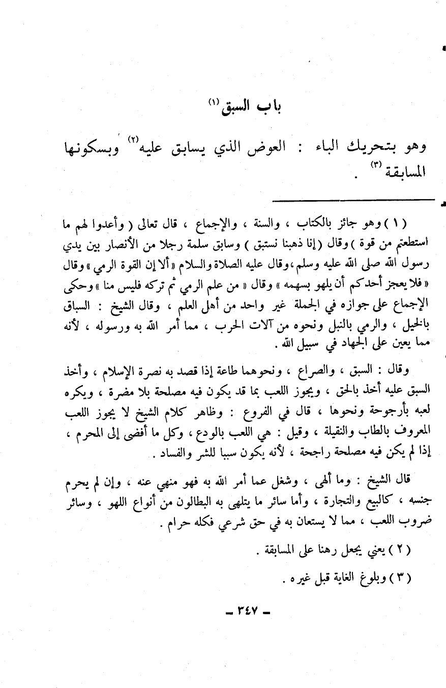 (¬1) وهو جائز بالكتاب، والسنة، والإجماع، قال تعالى {وَأَعِدُّوا لَهُمْ مَا اسْتَطَعْتُمْ مِنْ قُوَّةٍ} وقال {إِنَّا ذَهَبْنَا نَسْتَبِقُ} وسابق سلمة رجلا من الأنصار بين يدي رسول الله صلى الله عليه وسلم، وقال عليه الصلاة والسلام «ألا إن القوة الرمي» وقال «فلا يعجز أحدكم أن يلهو بسهمه» وقال «من علم الرمي ثم تركه فليس منا» وحكى الإجماع على جوازه في الجملة غير واحد من أهل العلم، وقال الشيخ: السباق بالخيل، والرمي بالنبل ونحوه من آلات الحرب، مما أمر الله به ورسوله، لأنه مما يعين على الجهاد في سبيل الله.
