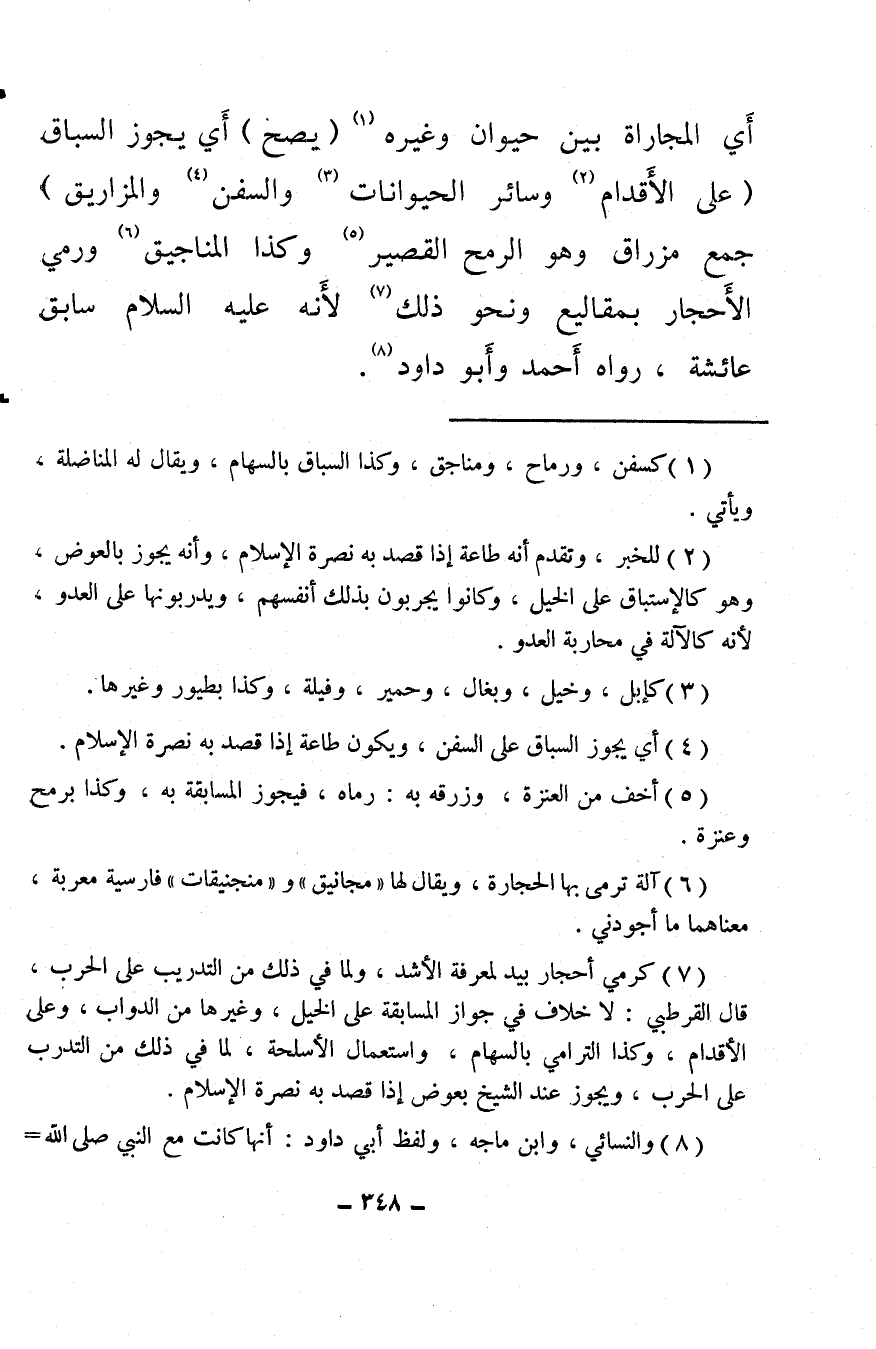 (¬7) كرمي أحجار بيد لمعرفة الأشد، ولما في ذلك من التدريب على الحرب، قال القرطبي: لا خلاف في جواز المسابقة على الخيل، وغيرها من الدواب، وعلى الأقدام، وكذا الترامي بالسهام، واستعمال الأسلحة، لما في ذلك من التدريب على الحرب، ويجوز عند الشيخ بعوض إذا قصد به نصرة الإسلام.