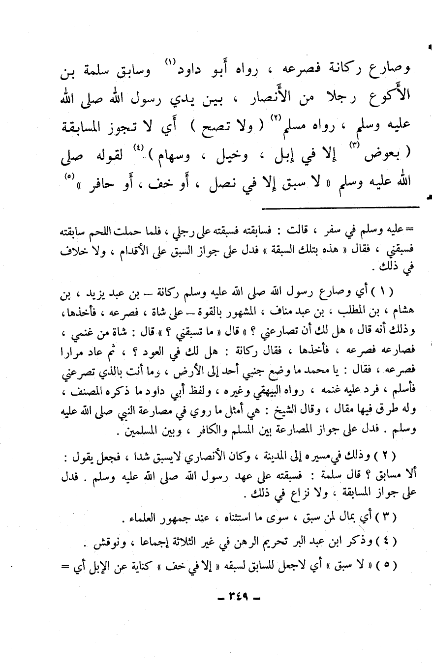 وصارع ركانة فصرعه، رواه أبو داود (¬1) وسابق سلمة بن الأكوع رجلا من الأنصار، بين يدي رسول الله صلى الله عليه وسلم، رواه مسلم (¬2) (ولا تصح) أي لا تجوز المسابقة (بعوض (¬3) إلا في إبل، وخيل، وسهام) (¬4) لقوله صلى الله عليه وسلم «لا سبق إلا في نصل، أو خف، أو حافر» (¬5) .