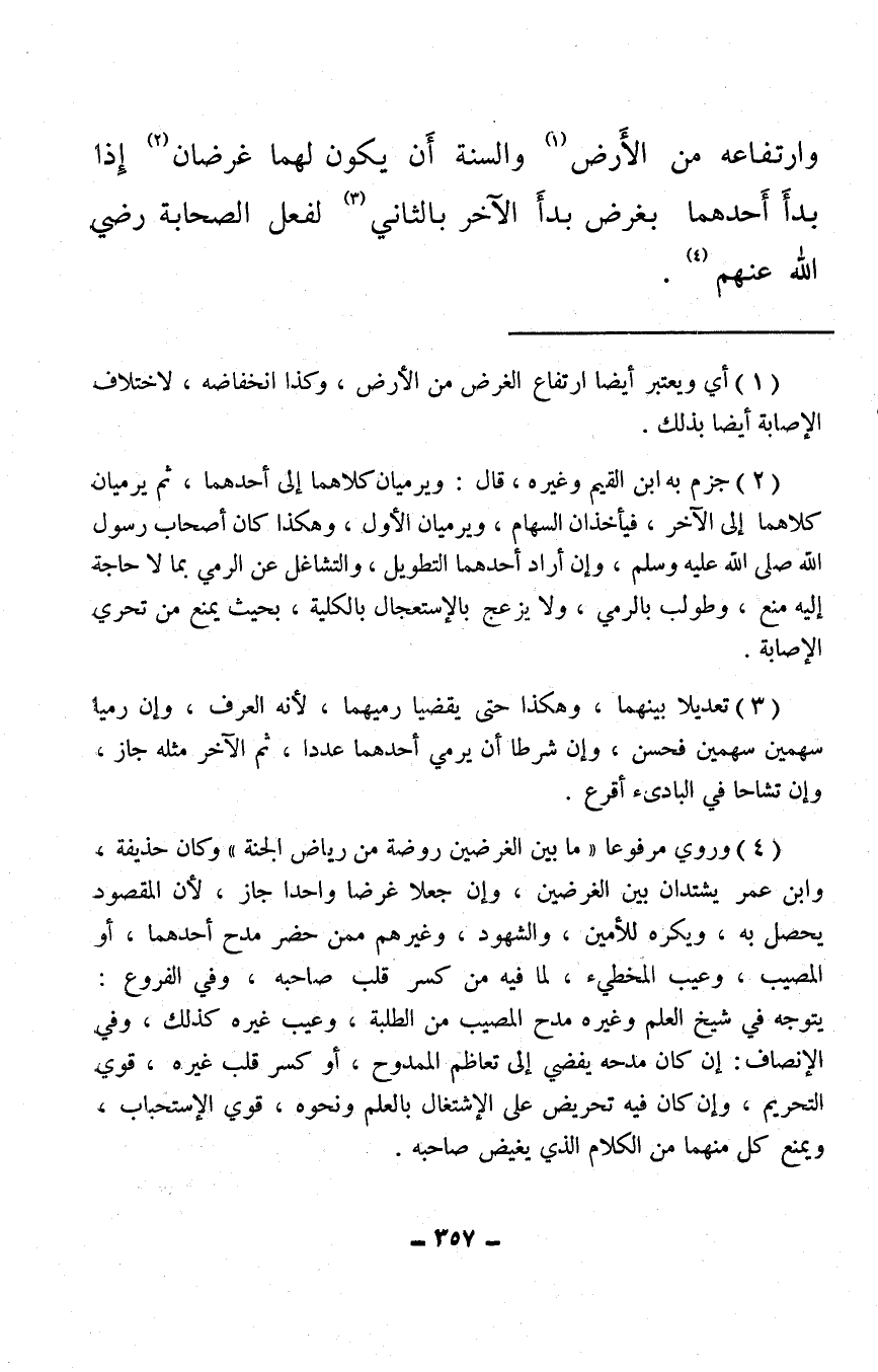 (¬4) وروي مرفوعًا «ما بين الغرضين روضة من رياض الجنة» وكان حذيفة، وابن عمر يشتدان بين الغرضين، وإن جعلا غرضا واحدا جاز، لأن المقصود يحصل به، ويكره للأمين، والشهود، وغيرهم ممن حضر مدح أحدهما، أو المصيب، وعيب المخطيء، لما فيه من كسر قلب صاحبه، وفي الفروع: يتوجه في شيخ العلم وغيره مدح المصيب من الطلبة، وعيب غيره كذلك، وفي الإنصاف: إن كان مدحه يفضي إلى تعاظم الممدوح، أو كسر قلب غيره، قوي التحريم، وإن كان فيه تحريض على الاشتغال بالعلم ونحوه، قوي الاستحباب، ويمنع كل منهما من الكلام الذي يغيض صاحبه.