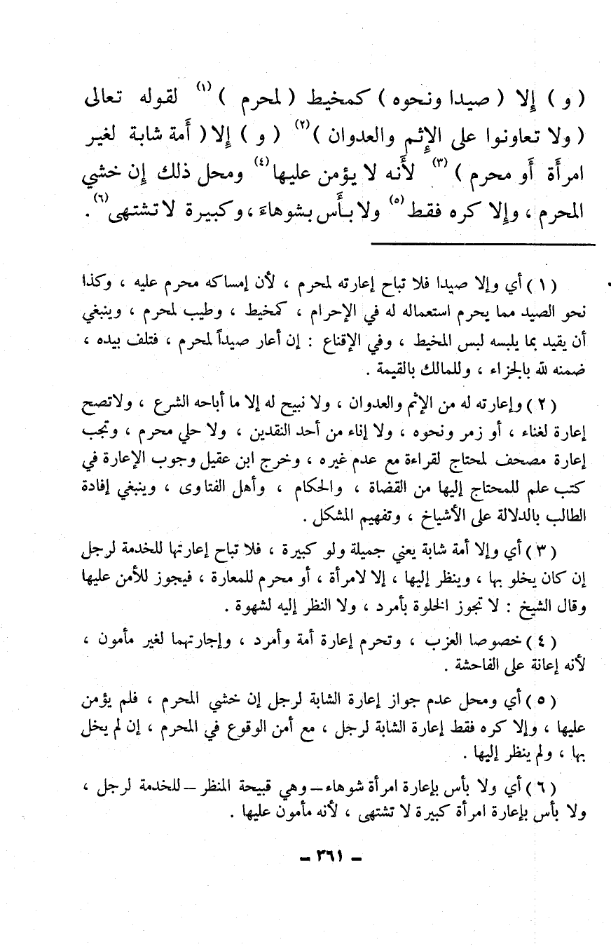 (¬2) وإعارته له من الإثم والعدوان، ولا نبيح له إلا ما أباحه الشرع، ولا تصح إعارة لغناء، أو زمر ونحوه، ولا إناء من أحد النقدين، ولا حلي محرم، وتجب إعارة مصحف لمحتاج لقراءة مع عدم غيره، وخرج ابن عقيل وجوب الإعارة في كتب علم للمحتاج إليها من القضاة، والحكام، وأهل الفتاوى، وينبغي إفادة الطالب بالدلالة على الأشياخ، وتفيهم المشكل.