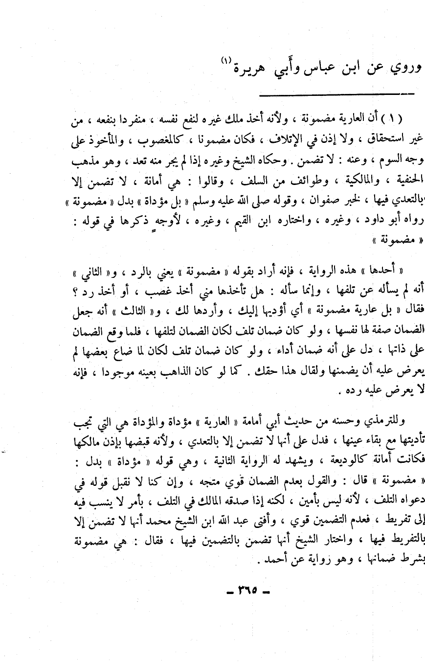 «أحدها» هذه الرواية، فإنه أراد بقوله «مضمونة» يعني بالرد، و «الثاني» أنه لم يسأل عن تلفها، وإنما سأله: هل تأخذها مني أخذ غصب، أو أخذ رد؟ فقال «بل عارية مضمونة» أي أؤديها إليك، وأردها لك، و «الثالث» أنه جعل الضمان صفة لها نفسها، ولو كان ضمان تلف لكان الضمان لتلفها، فلما وقع الضمان على ذاتها، دل على أنه ضمان أداء، ولو كان ضمان تلف لكان لما ضاع بعضها لم يعرض عليه أن يضمنها ولقال هذا حقك. كما لو كان الذاهب بعينه موجودًا، فإنه لا يعرض عليه رده.