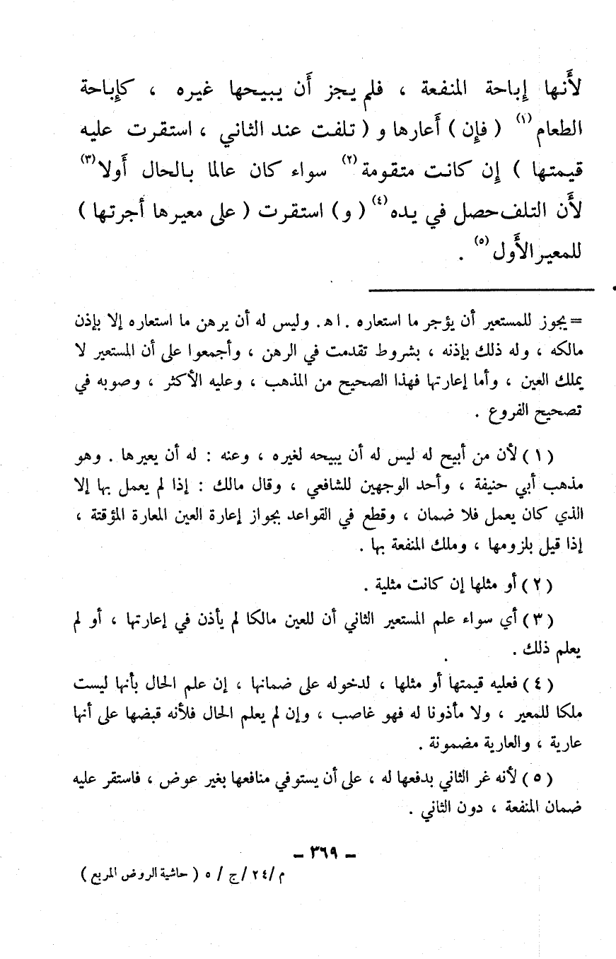 (¬4) فعليه قيمتها أو مثلها، لدخوله على ضمانها، إن علم الحال بأنها ليست ملكا للمعير، ولا مأذونا له فهو غاصب، وإن لم يعلم الحال فلأنه قبضها على أنها عارية، والعارية مضمونة.
