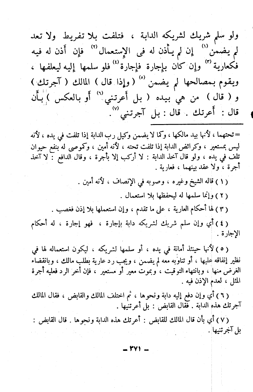 (¬5) لأنها حينئذ أمانة في يده، أو سلمها لشريكه، ليكون استعماله لها في نظير إنفاقه عليها، أو تناوبه معه لم يضمن، ويجب رد عارية بطلب مالك، وبانقضاء الغرض منها، وبانتهاء التوقيت، وبموت معير أو مستعير، فإن أخر الرد فعليه أجرة المثل، لعدم الإذن فيه.