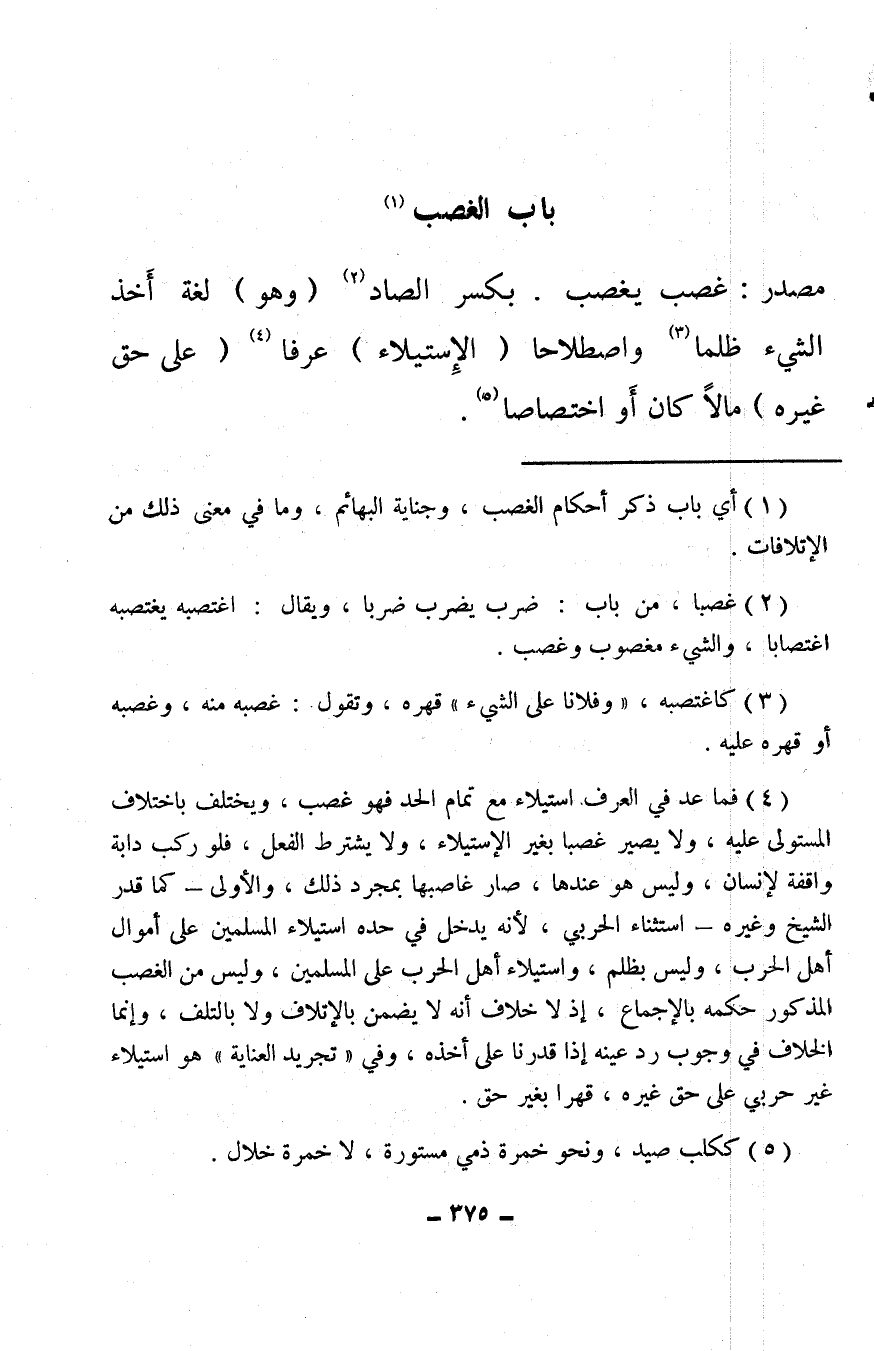 (¬4) فما عد في العرف استيلاء مع تمام الحد فهو غصب، ويختلف باختلاف المستولى عليه، ولا يصير غصبًا بغير الاستيلاء، ولا يشترط الفعل، فلو ركب دابة واقفة لإنسان، وليس هو عندها، صار غاصبها بمجرد ذلك، والأولى – كما قدر الشيخ وغيره – استثناء الحربي، لأنه يدخل في حده استيلاء المسلمين على أموال أهل الحرب، وليس بظلم، واستيلاء أهل الحرب على المسلمين، وليس من الغصب المذكور حكمه بالإجماع، إذ لا خلاف أنه لا يضمن بالإتلاف ولا بالتلف، وإنما الخلاف في وجوب رد عينه إذا قدرنا على أخذه، وفي «تجريد العناية» هو استيلاء غير حربي على حق غيره، قهرا بغير حق.