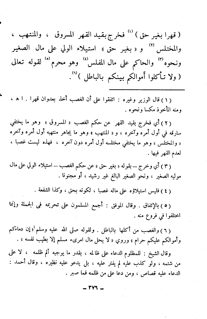 (¬6) والغصب من أكلها بالباطل. ولقول صلى الله عليه وسلم «إن دماءكم وأموالكم عليكم حرام» وروي «لا يحل مال امرئ مسلم إلا بطيب نفسه» .