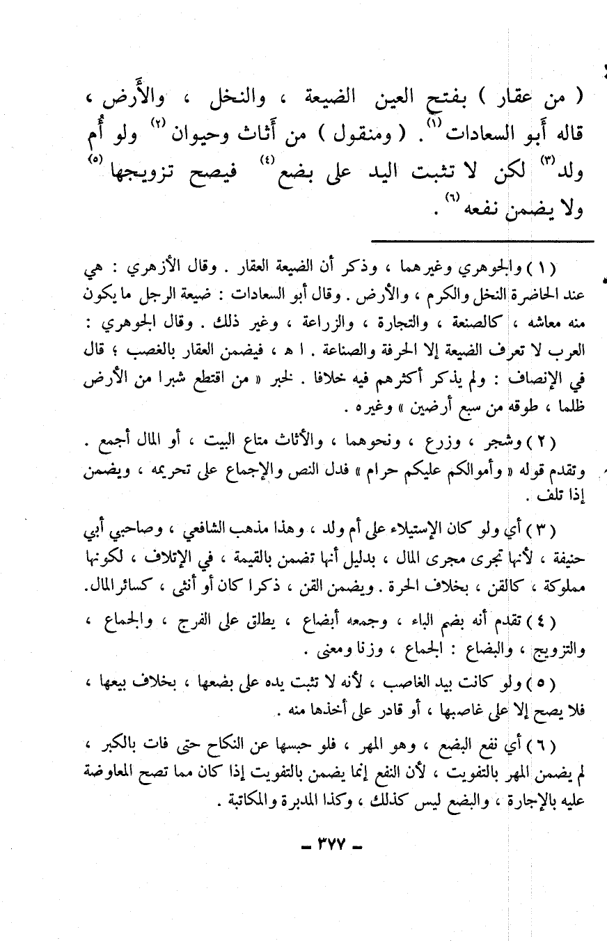 (¬1) والجوهري وغيرهما، وذكر أن الضيعة العقار. وقال الأزهري: هي عند الحاضرة النخل والكرم، والأرض. وقال أبو السعادات: ضيعة الرجل ما يكون منه معاشه، كالصنعة، والتجارة، والزراعة، وغير ذلك. وقال الجوهري: العرب لا تعرف الضيعة إلا الحرفة والصناعة. اهـ. فيضمن العقار بالغصب؛ قال في الإنصاف: ولم يذكر أكثرهم فيه خلافًا. لخبر «من اقتطع شبرًا من الأرض ظلمًا، طوقه من سبع أرضين» وغيره.