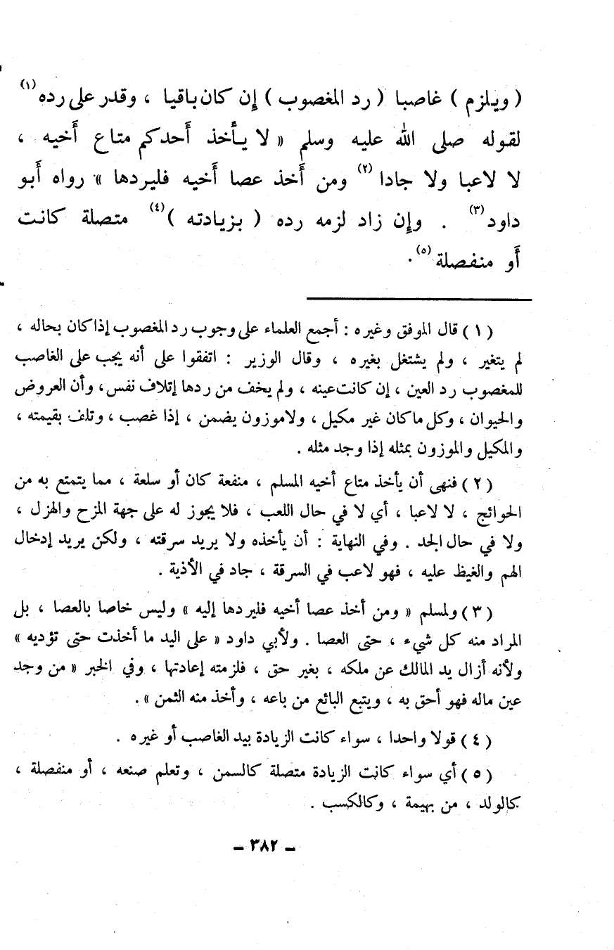 (¬3) ولمسلم «ومن أخذ عصا أخيه فليردها إليه» وليس خاصا بالعصا، بل المراد منه كل شيء، حتى العصا. ولأبي داود «على اليد ما أخذت حتى تؤديه» ولأنه أزال يد المالك عن ملكه، بغير حق، فلزمته إعادتها، وفي الخبر «من وجد عين ماله فهو أحق به، ويتبع البائع من باعه، وأخذ منه الثمن» .
