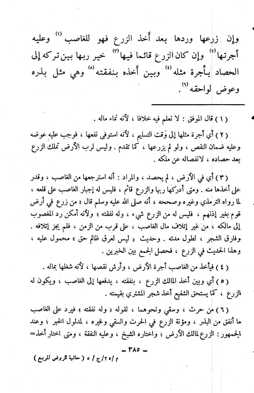 (¬6) من حرث، وسقي ونحوهما، لقوله «وله نفقته» فيرد على الغاصب ما أنفق من البذر، ومؤنة الزرع في الحرث والسقي وغيره، لمدلول الخبر؛ وعند الجمهور: الزرع لمالك الأرض؛ واختاره الشيخ، وعليه النفقة، ومتى اختار أخذ