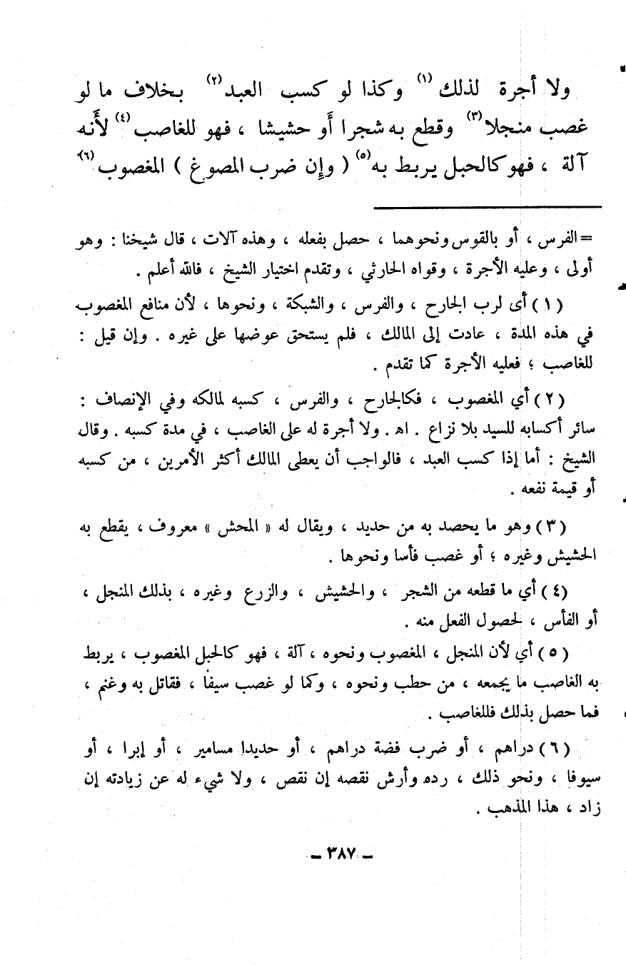 (¬3) وهو ما يحصد به من حديد، ويقال له «المحش» معروف، يقطع به الحشيش وغيره؛ أو غصب فأسًا ونحوها.