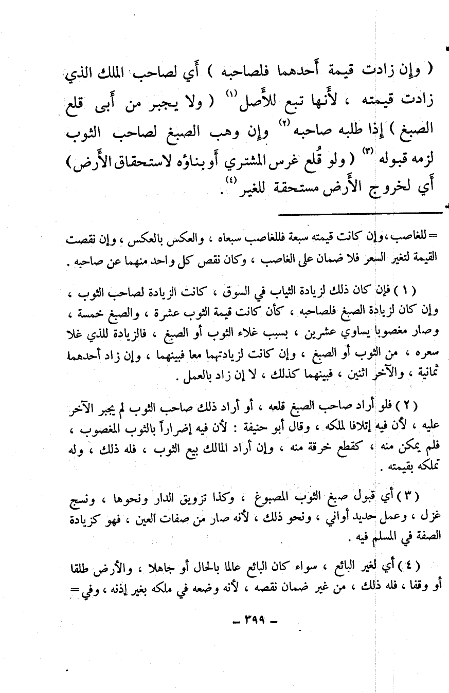(¬1) فإن كان ذلك لزيادة الثياب في السوق، كانت الزيادة لصاحب الثوب، وإن كان لزيادة الصبغ فلصاحبه، كأن كانت قيمة الثوب عشرة، والصبغ خمسة، وصار مغصوبًا يساوي عشرين، بسبب غلاء الثوب أو الصبغ، فالزيادة للذي غلا سعره، من الثوب أو الصبغ، وإن كانت لزيادتهما معا فبينهما، وإن زاد أحدهما ثمانية، والآخر اثنين، فبينهما كذلك، لا إن زاد بالعمل.