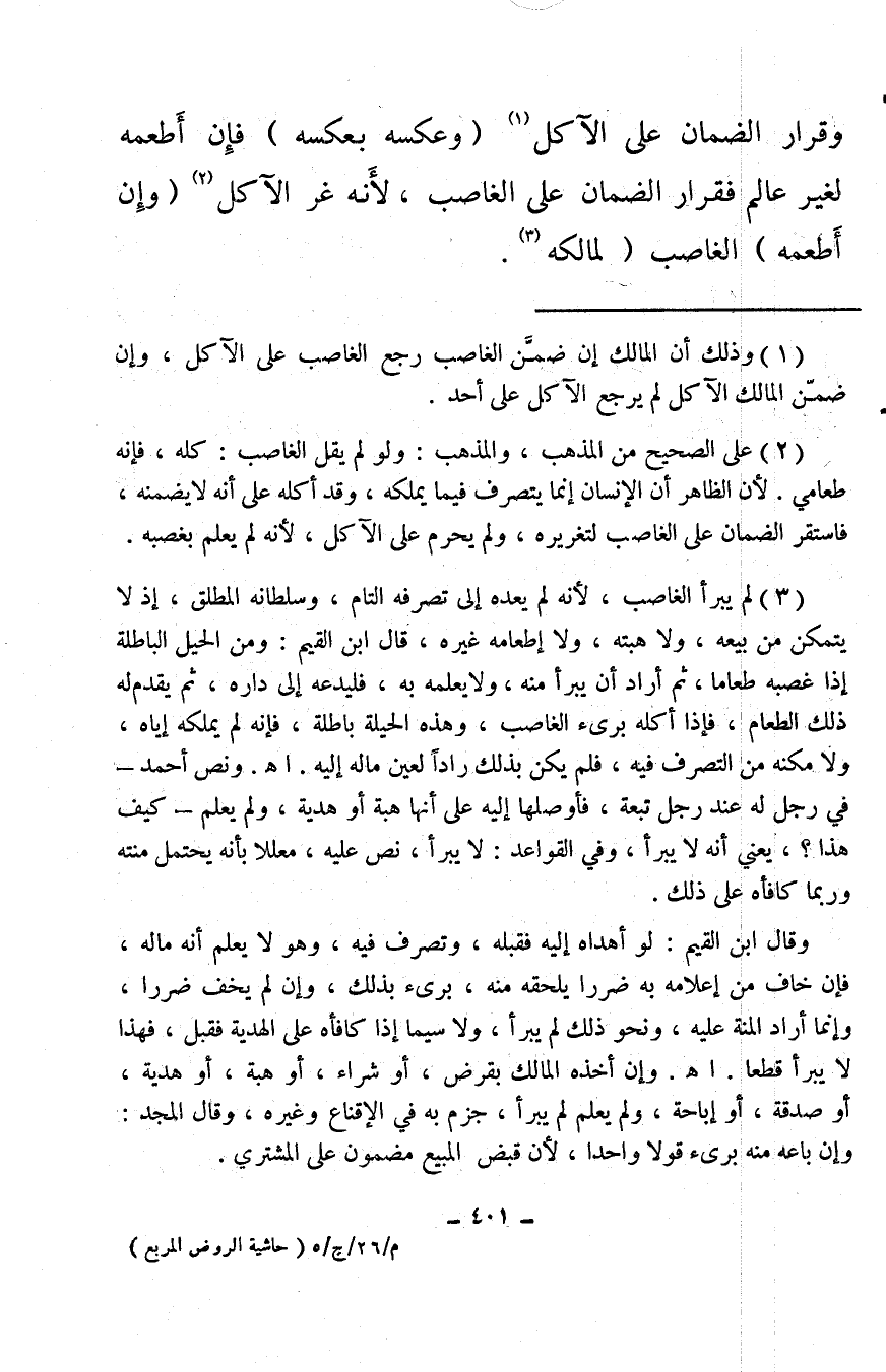 (¬1) وذلك أن المالك إن ضمَّن الغاصب رجع الغاصب على الآكل، وإن ضمَّن المالك الآكل لم يرجع الآكل على أحد.