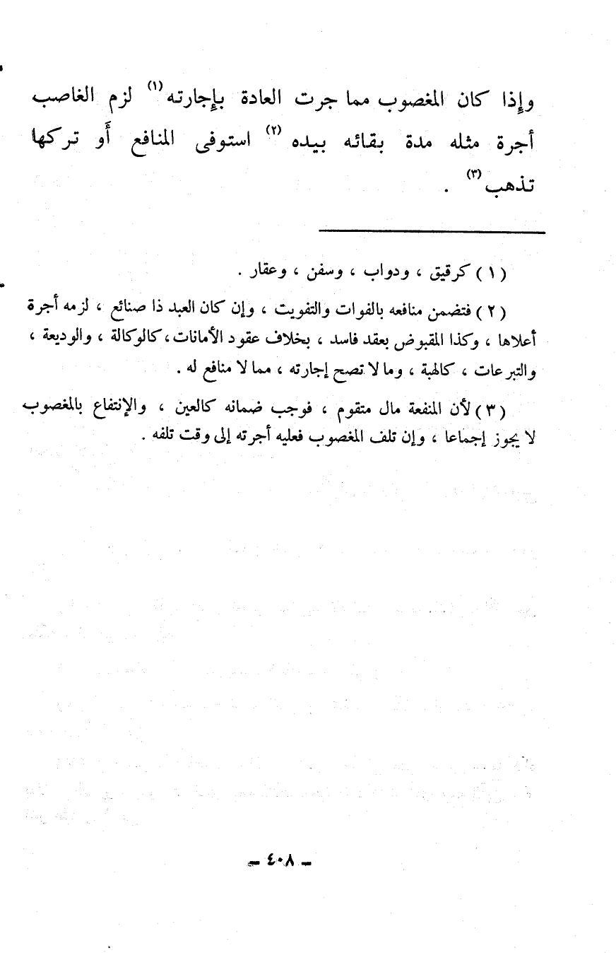 (¬3) لأن المنفعة مال متقوم، فوجب ضمانه كالعين، والانتفاع بالمغصوب لا يجوز إجماعًا، وإن تلف المغصوب فعليه أجرته إلى وقت تلفه.