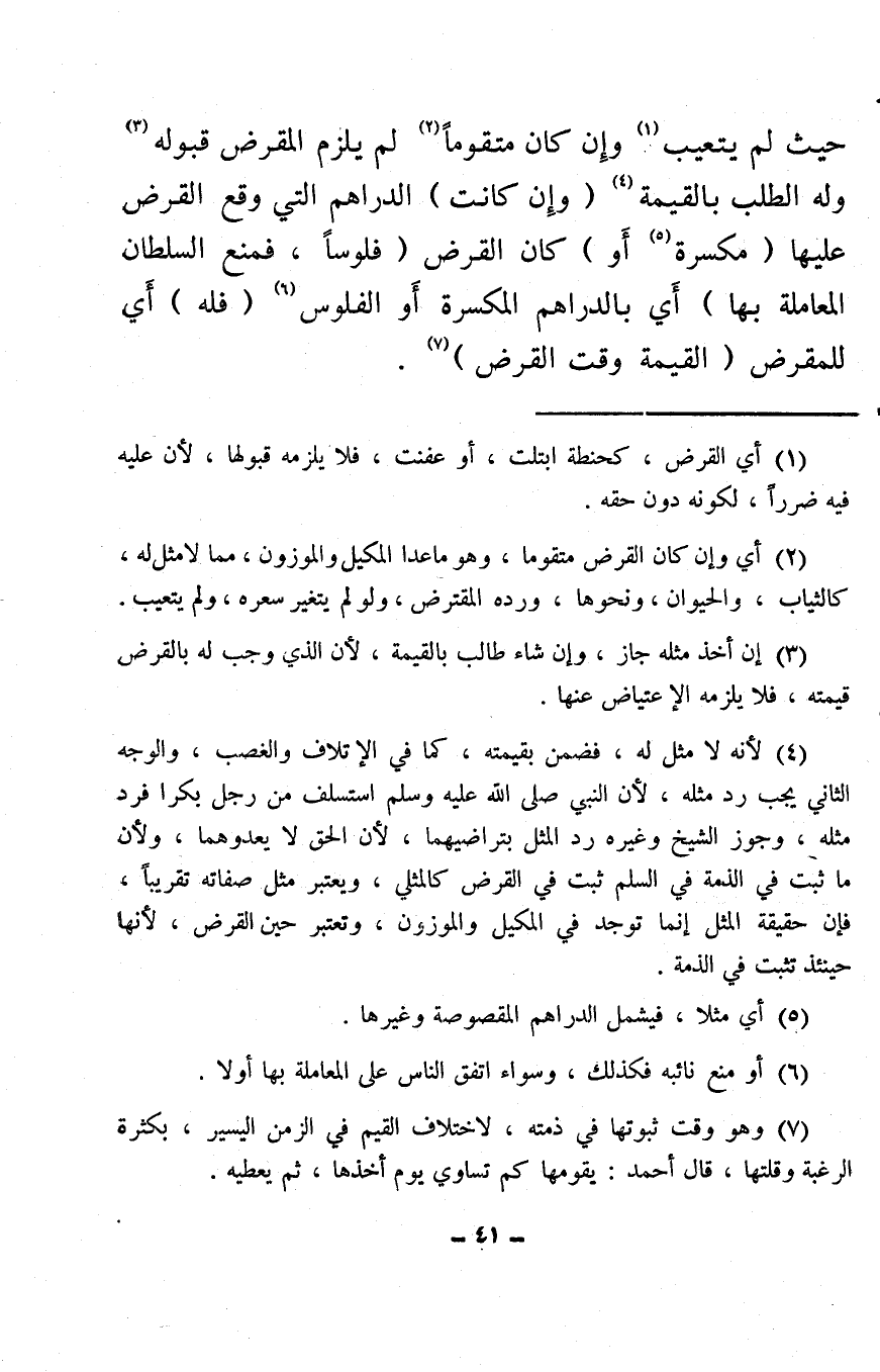 حيث لم يتعيب (¬1) وإن كان متقومًا (¬2) لم يلزم المقرض قبوله (¬3) وله الطلب بالقيمة (¬4) (وإن كانت) الدراهم التي وقع القرض عليها (مكسرة (¬5) أو) كان القرض (فلوسًا، فمنع السلطان المعاملة بها) أي بالدراهم المكسرة أو الفلوس (¬6) (فله) أي للمقرض (القيمة وقت القرض) (¬7) .