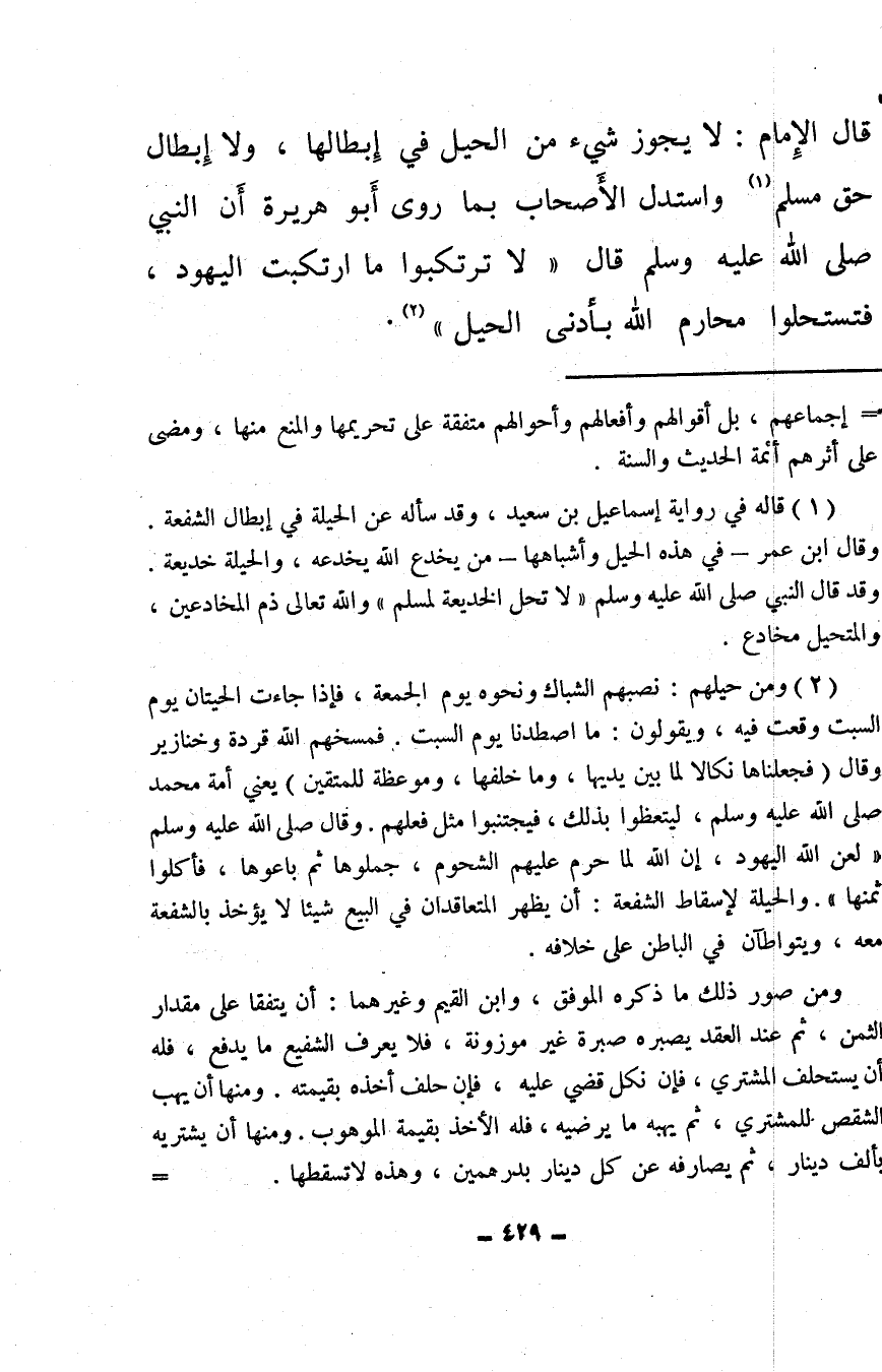 (¬1) قاله في رواية إسماعيل بن سعيد، وقد سأله عن الحيلة في إبطال الشفعة. وقال ابن عمر – في هذه الحيل وأشباهها – من يخدع الله يخدعه، والحيلة خديعة. وقد قال النبي صلى الله عليه وسلم «لا تحل الخديعة لمسلم» والله تعالى ذم المخادعين، والمتحيل مخادع.