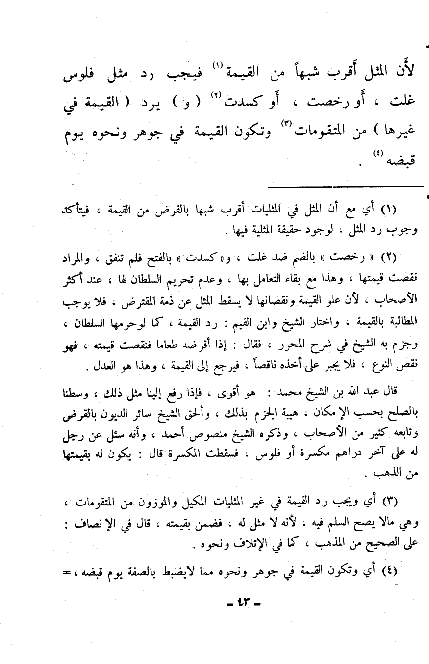 (¬2) "رخصت" بالضم ضد غلت، و"كسدت" بالفتح فلم تنفق، والمراد نقصت قيمتها، وهذا مع بقاء التعامل بها، وعدم تحريم السلطان لها، عند أكثر الأصحاب، لأن علو القيمة ونقصانها لا يسقط المثل عن ذمة المقترض، فلا يوجب المطالبة بالقيمة، واختار الشيخ وابن القيم: رد القيمة، كما لو حرمها السلطان، وجزم به الشيخ في شرح المحرر، فقال: إذا أقرضه طعامًا فنقصت قيمته، فهو نقص النوع، فلا يجبر على أخذه ناقصًا، فيرجع إلى القيمة، وهذا هو العدل.
