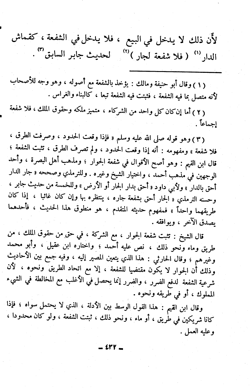 (¬3) وهو قول صلى الله عليه وسلم «فإذا وقعت الحدود، وصرفت الطرق، فلا شفعة» ومفهومه: أنه إذا وقعت الحدود، ولم تصرف الطرق، تثبت الشفعة؛ قال ابن القيم: وهو أصح الأقوال في شفعة الجوار؛ ومذهب أهل البصرة، وأحد الوجهين في مذهب أحمد، واختيار الشيخ وغيره. وللترمذي وصححه «جار الدار أحق بالدار» ولأبي داود «أحق بدار الجار أو الأرض» وللخمسة من حديث جابر، وحسنه الترمذي «الجار أحق بشفعة جاره، ينتظره بها وإن كان غائبًا، إذا كان طريقهما واحدًا» فمفهوم حديثه المتقدم، هو منطوق هذا الحديث، فأحدهما يصدق الآخر، ويوافقه.
