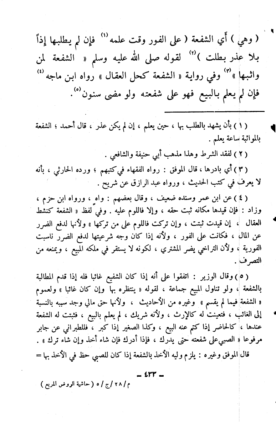 (¬4) عن ابن عمر وسنده ضعيف، وقال بعضهم: واهٍ، ورواه ابن حزم، وزاد: فإن قيدها مكانه ثبت حقه، وإلا فاللوم عليه. وفي لفظ «الشفعة كنشط العقال، إن قيدت ثبتت، وإن تركت فاللوم على من تركها» ولأنها لدفع الضرر عن المال، فكانت على الفور، ولأنه إذا كان وجه شرعيتها لدفع الضرر ناسبت الفورية، ولأن التراخي يضر المشتري، لكونه لا يستقر في ملكه المبيع، ويمنعه من التصرف.