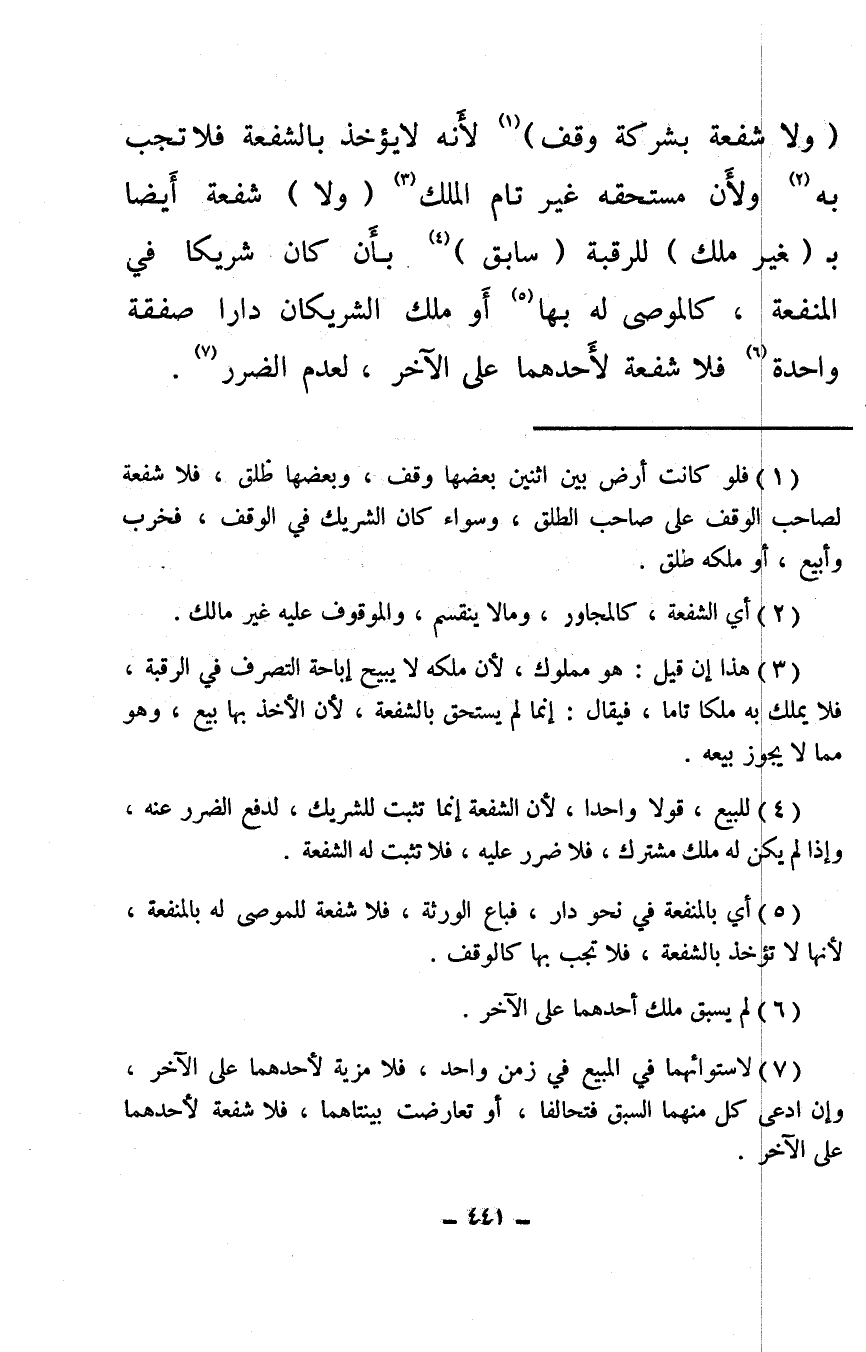 (¬1) فلو كانت أرض بين اثنين بعضها وقف، وبعضها طلق، فلا شفعة لصاحب الوقف على صاحب الطلق، وسواء كان الشريك في الوقف، فخرب وأبيع، أو ملكه طلق.