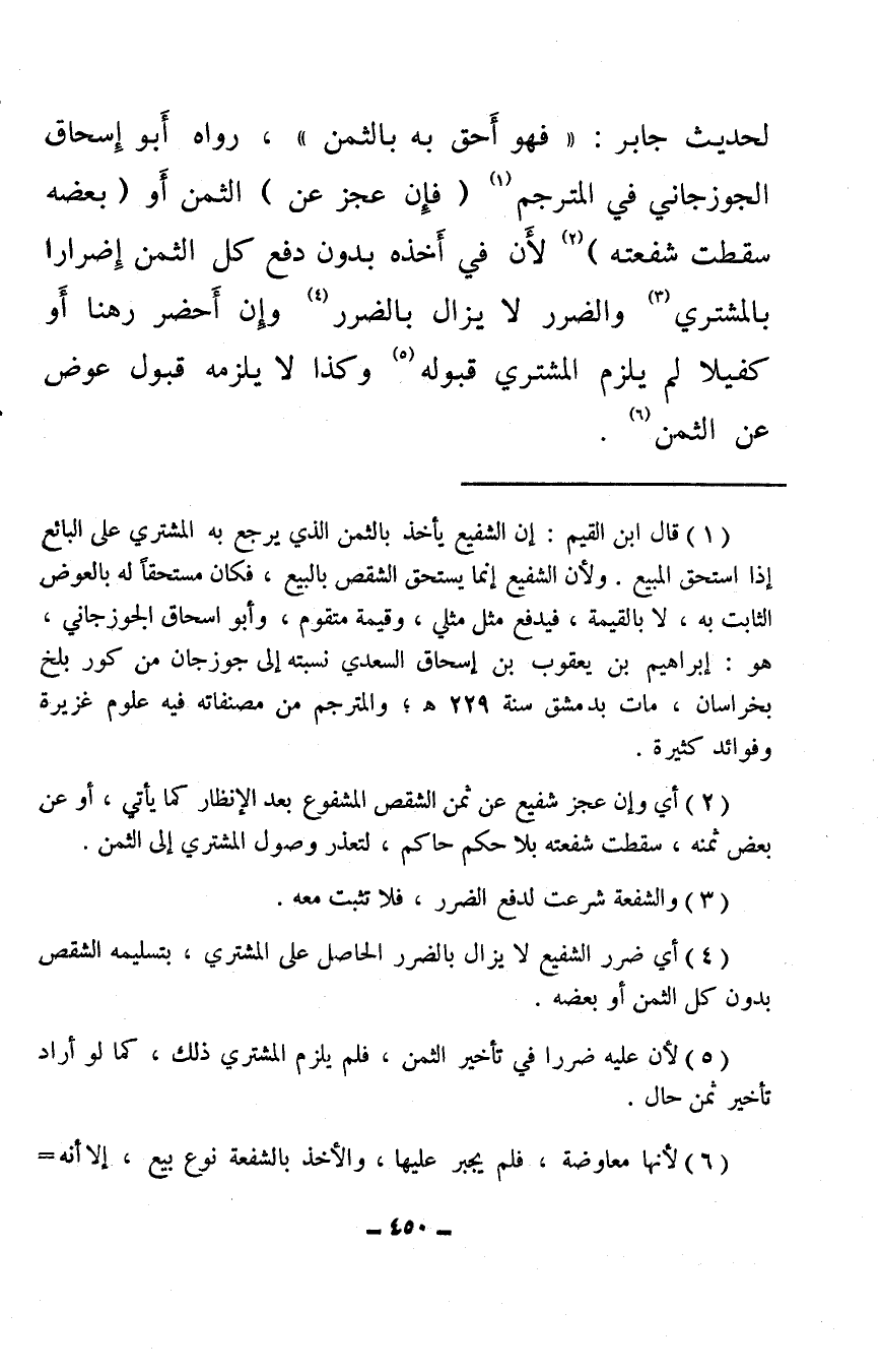 (¬1) قال ابن القيم: إن الشفيع يأخذ بالثمن الذي يرجع به المشتري على البائع إذا استحق المبيع. ولأن الشفيع إنما يستحق الشقص بالبيع، فكان مستحقًا له بالعوض الثابت به، لا بالقيمة، فيدفع مثل مثلي، وقيمة متقوم، وأبو إسحاق الجوزجاني، هو: إبراهيم بن يعقوب بن إسحاق السعدي نسبته إلى جوزجان من كوربلخ بخراسان، مات بدمشق سنة 229هـ؛ والمترجم من مصنفاته فيه علوم غزيرة وفوائد كثيرة.