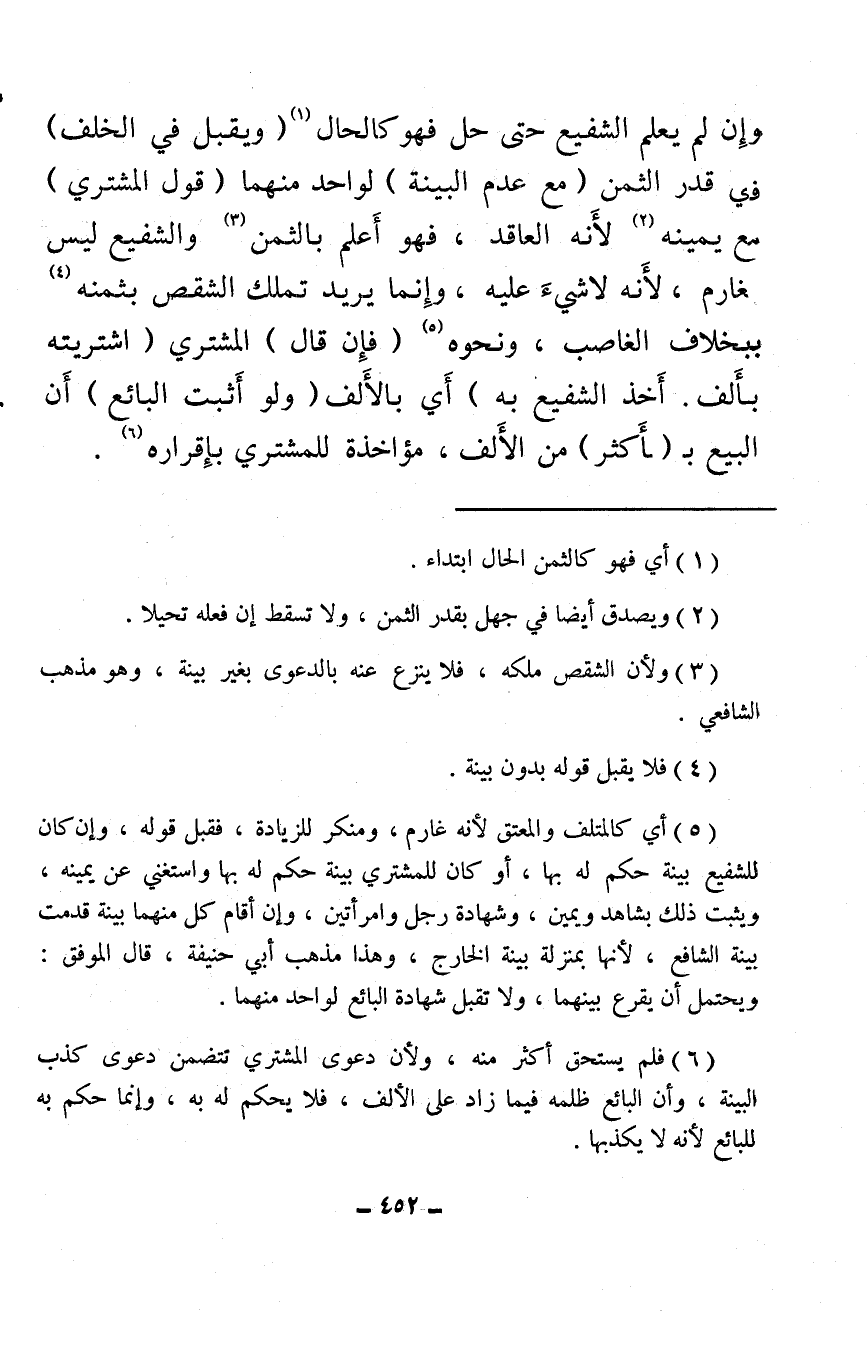 (¬5) أي كالمتلف والمعتق لأنه غارم، ومنكر للزيادة، فقبل قوله، وإن كان للشفيع بينة حكم له بها، أو كان للمشتري بينة حكم له بها واستغني عن يمينه، ويثبت ذلك بشاهد ويمين، وشهادة رجل وامرأتين، وإن أقام كل منهما بينة قدمت بينة الشافع، لأنها بمنزلة بينة الخارج، وهذا مذهب أبي حنيفة، قال الموفق: ويحتمل أن يقرع بينهما، ولا تقبل شهادة البائع لواحد منهما.