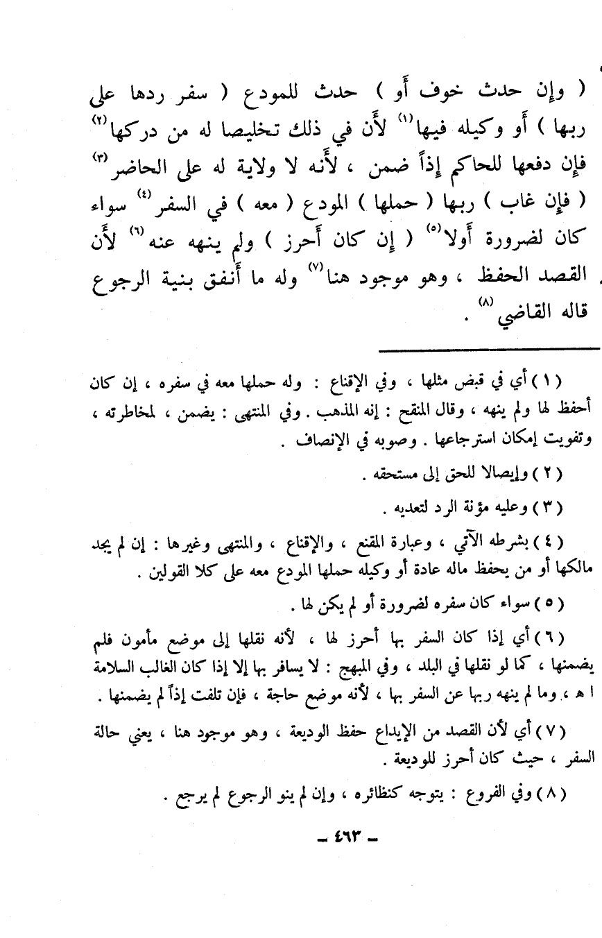 (¬7) أي لأن القصد من الإيداع حفظ الوديعة، وهو موجود هنا، يعني حالة السفر، حيث كان أحرز للوديعة.