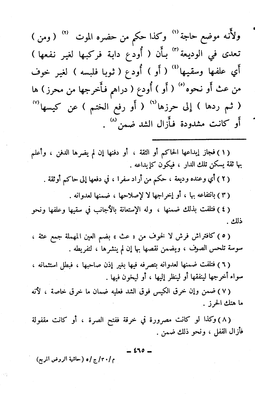 ولأنه موضع حاجة (¬1) وكذا حكم من حضره الموت (¬2) (ومن) تعدى في الوديعة (¬3) بان (أُودع دابة فركبها لغير نفعها) أي علفها وسقيها (¬4) (أو) أُودع (ثوبا فلبسه) لغير خوف من عث أو نحوه (¬5) (أو) أُودع (دراهم فأَخرجها من محرز) ها (ثم ردها) إلى حرزها (¬6) (أو رفع الختم) عن كيسها (¬7) أو كانت مشدودة فأَزال الشد ضمن (¬8) .