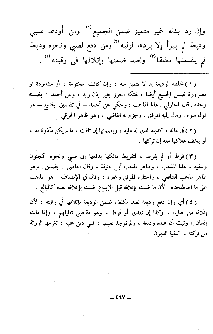 (¬4) أي وإن دفع وديعة لعبد مكلف ضمن الوديعة بإتلافها في رقبته، لأن إتلافه من جنايته، وكذا إن تعدى أو فرط، وهو مقتضى تعليلهم، وإذا مات إنسان، وثبت أن عنده وديعة، ولم توجد بعينها، فهي دين عليه، تغرمها الورثة من تركته، كبقية الديون.
