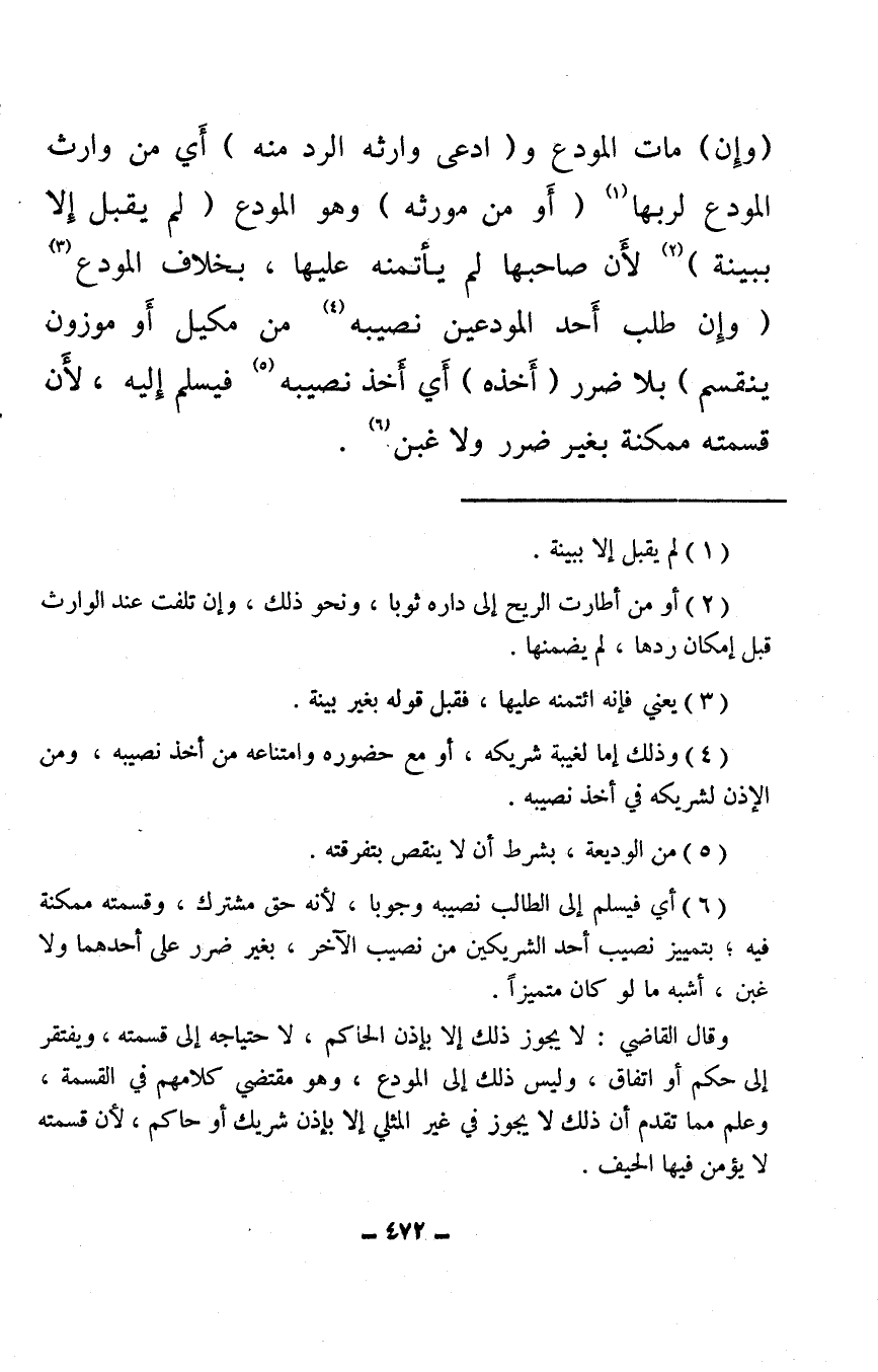(وإن) مات المودع و (ادعى وارثه الرد منه) أي من وارث المودع لربها (¬1) (أو من مورثه) وهو المودع (لم يقبل إلا ببينة) (¬2) لأن صاحبها لم يأتمنه عليها، بخلاف المودع (¬3) (وإن طلب أحد المودعين نصيبه (¬4) من مكيل أو موزون ينقسم) بلا ضرر (أخذه) أي أَخذ نصيبه (¬5) فيسلم إليه، لأن قسمته ممكنة بغير ضرر ولا غبن (¬6) .