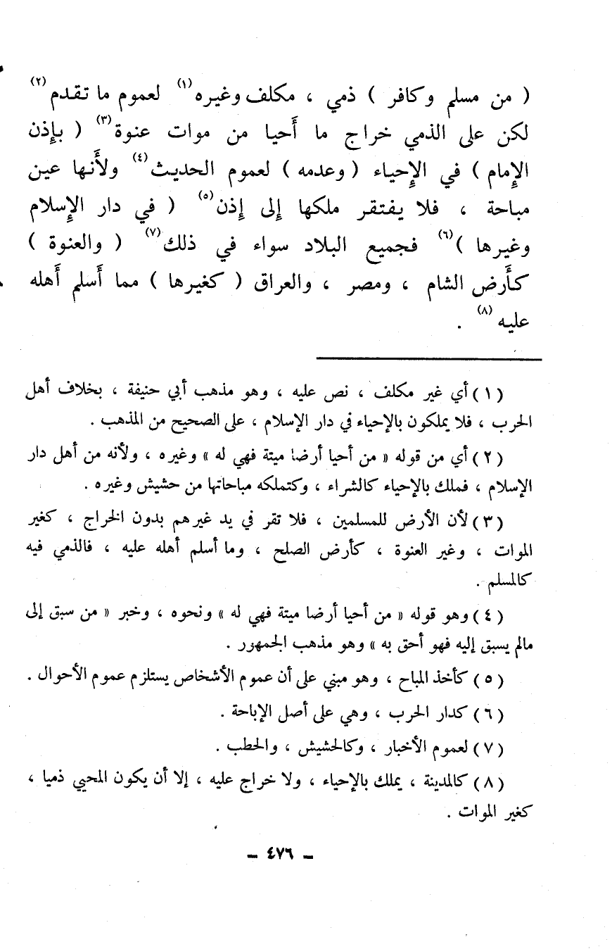 (¬8) كالمدينة، يملك بالإحياء، ولا خراج عليه، إلا أن يكون المحيي ذميًا، كغير الموات.