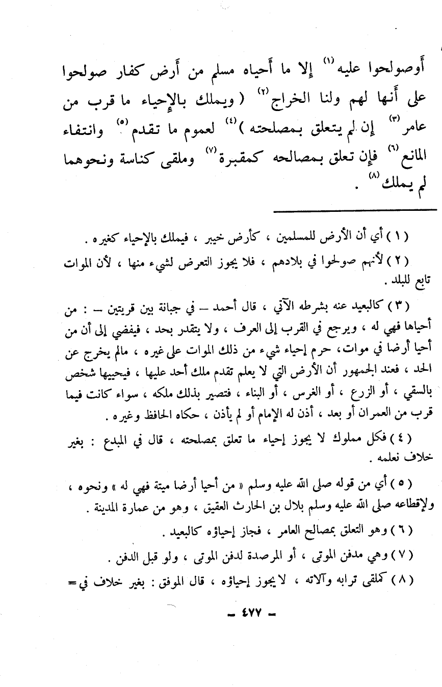 (¬3) كالبعيد عنه بشرطه الآتي، قال أحمد – في جبانة بين قريتين -: من أحياها فهي له، ويرجع في القرب إلى العرف، ولا يتقدر بحد، فيفضي إلى أن من أحيا أرضا في موات، حرم إحياء شيء من ذلك الموات على غيره، ما لم يخرج عن الحد، فعند الجمهور أن الأرض التي لا يعلم تقدم ملك أحد عليها، فيحييها شخص بالسقي، أو الزرع، أو الغرس، أو البناء، فتصير بذلك ملكه، سواء كانت فيما قرب من العمران أو بعد، أذن له الإمام أو لم يأذن، حكاه الحافظ وغيره.
