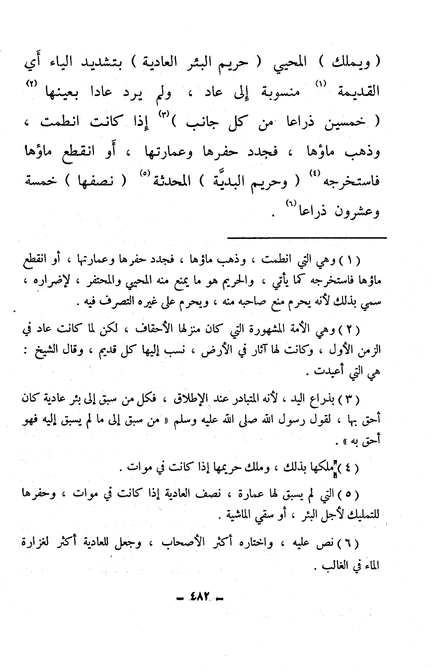 (ويملك) المحيي (حريم البئر العاديَّة) بتشديد الياء أي القديمة (¬1) منسوبة إلى عاد، ولم يرد عادا بعينها (¬2) (خمسين ذراعا من كل جانب) (¬3) إذا كانت انطمت، وذهب ماؤها، فجدد حفرها وعمارتها، أو انقطع ماؤها فاستخرجه (¬4) (وحريم البدَّية) المحدثة (¬5) (نصفها) خمسة وعشرون ذراعًا (¬6) .