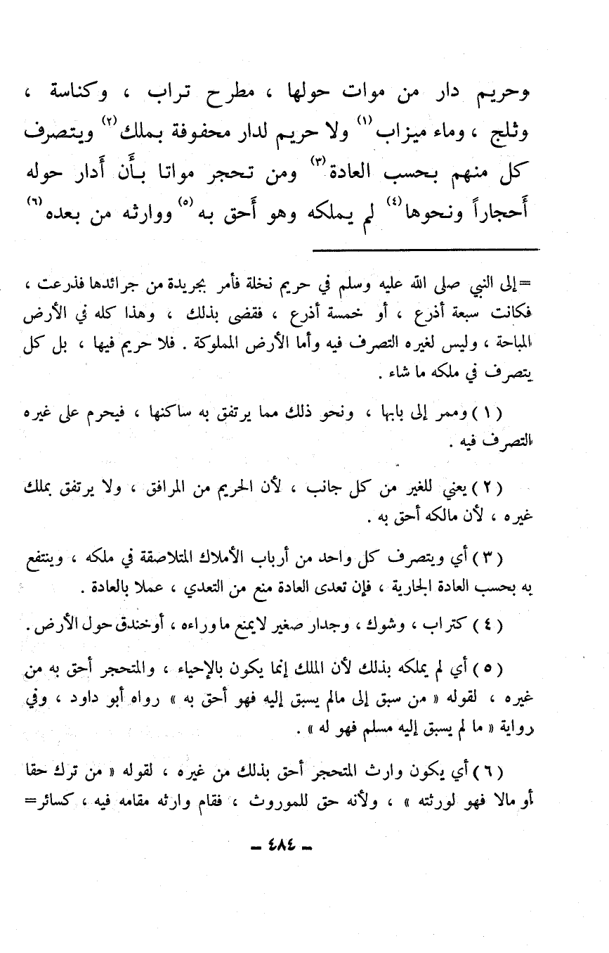 (¬5) أي لم يملكه بذلك لأن المالك إنما يكون بالإحياء، والمتحجر أحق به من غيره، لقوله «من سبق إلى ما لم يسبق إليه فهو أحق به» رواه أبو داود، وفي رواية «ما لم يسبق إليه مسلم فهو له» .