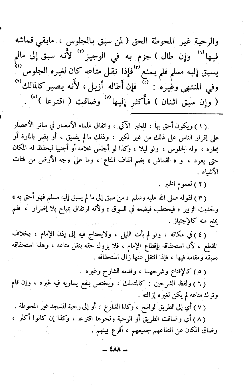 (¬1) ويكون أحق بها، للخبر الآتي، واتفاق علماء الأمصار في سائر الأعصار على إقرار الناس على ذلك من غير نكير، وذلك ما لم يضيق، أو يضر بالمارة أو بجاره، وله الجلوس، ولو ليلا، وكذا لو أجلس غلامه أو أجنبيا ليحفظ له المكان حتى يعود، و"القماش" بضم القاف المتاع، وما على وجه الأرض من فتات الأشياء.
