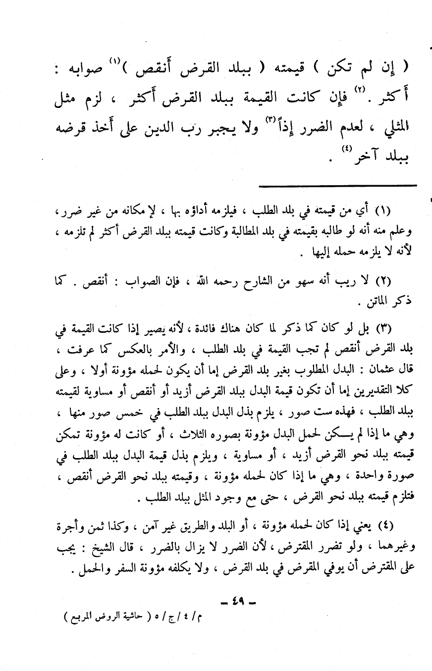 (¬4) يعني إذا كان لحمله مؤونة، أو البلد والطريق غير آمن، وكذا ثمن وأجرة وغيرهما، ولو تضرر المقترض، لأن الضرر لا يزال بالضرر، قال الشيخ: يجب على المقترض أن يوفي المقرض في بلد القرض، ولا يكلفه مؤونة السفر والحمل.