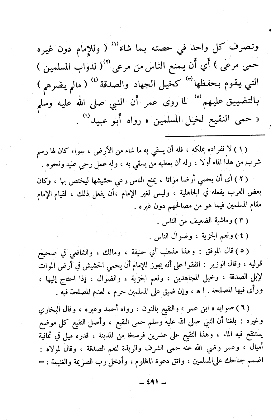 (¬5) قال الموفق: وهذا مذهب أبي حنيفة، ومالك، والشافعي في صحيح قوليه، وقال الوزير: اتفقوا على أنه يجوز للإمام أن يحمي الحشيش في أرض الموات لإبل الصدقة، وخيل المجاهدين، ونعم الجزية، والضوال، إذا احتاج إليها، ورأى فيها المصلحة. اهـ. وإن ضيق على المسلمين حرم، لعدم المصلحة فيه.