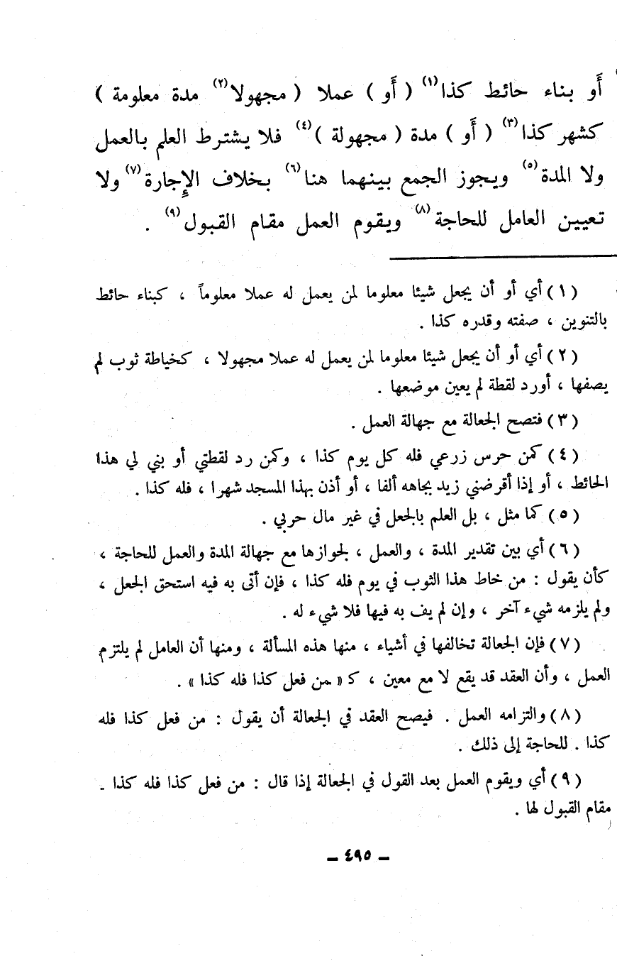 (¬7) فإن الجعالة تخالفها في أِشياء، منها هذه المسألة، ومنها أن العامل لم يلتزم العمل، وأن العقد قد يقع لا مع معين، كـ"ـمن فعل كذا فله كذا".