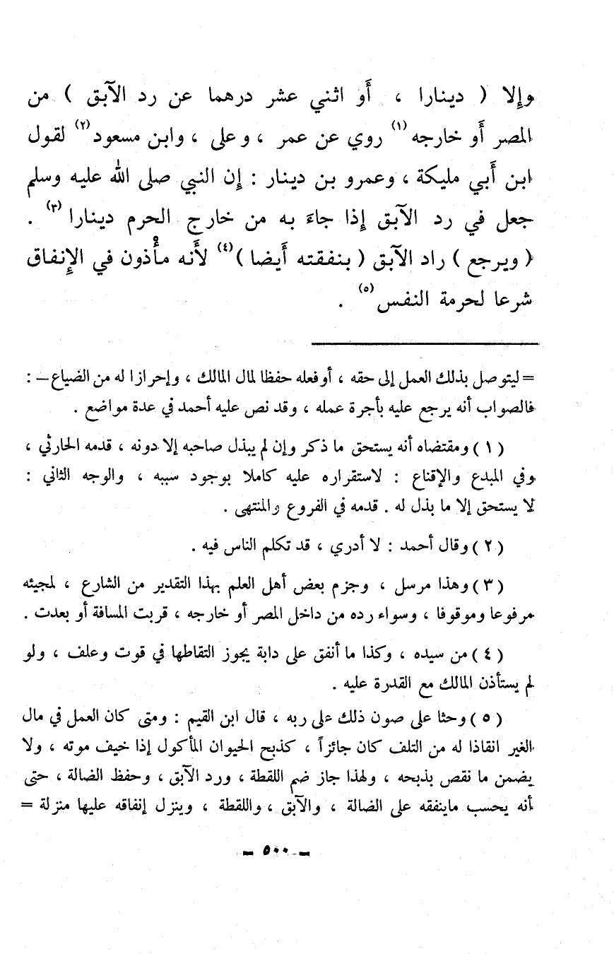 وإلا (دينارا، أو اثني عشر درهما عن رد الآبق) من المصر أو خارجه (¬1) روي عن عمر، وعلي، وابن مسعود (¬2) لقول ابن أبي مليكة، وعمرو بن دينار: إن النبي صلى الله عليه وسلم جعل في رد الآبق إذا جاء به من خارج الحرم دينارًا (¬3) . (ويرجع) راد الآبق (بنفقته أيضًا) (¬4) لأنه مأْذون في الإنفاق شرعًا لحرمة النفس (¬5) .