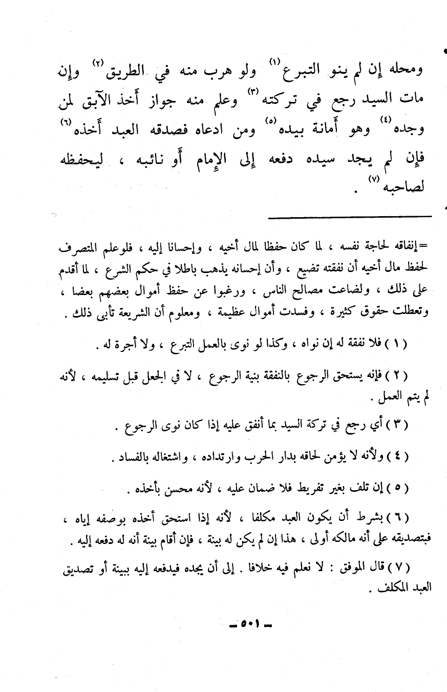 (¬6) بشرط أن يكون العبد مكلفا، لأنه إذا استحق أخذه بوصفه إياه، فبتصديقه على أنه مالكه أولى، هذا إن لم يكن له بينة، فإن أقام بينة أنه له دفعه إليه.