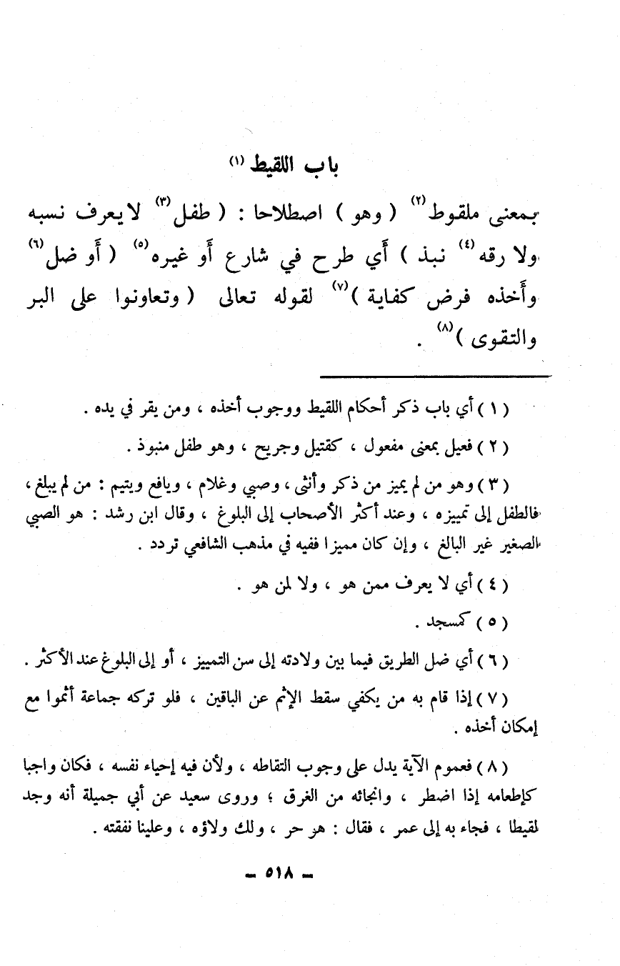 (¬8) فعموم الآية يدل على وجوب التقاطه، ولأن فيه إحياء نفسه، فكان واجبا كإطعامه إذا اضطر، وإنجائه من الغرق؛ وروى سعيد عن أبي جميلة أنه وجد لقيطًا، فجاء به إلى عمر، فقال: هو حر، ولك ولاؤه، وعلينا نفقته.