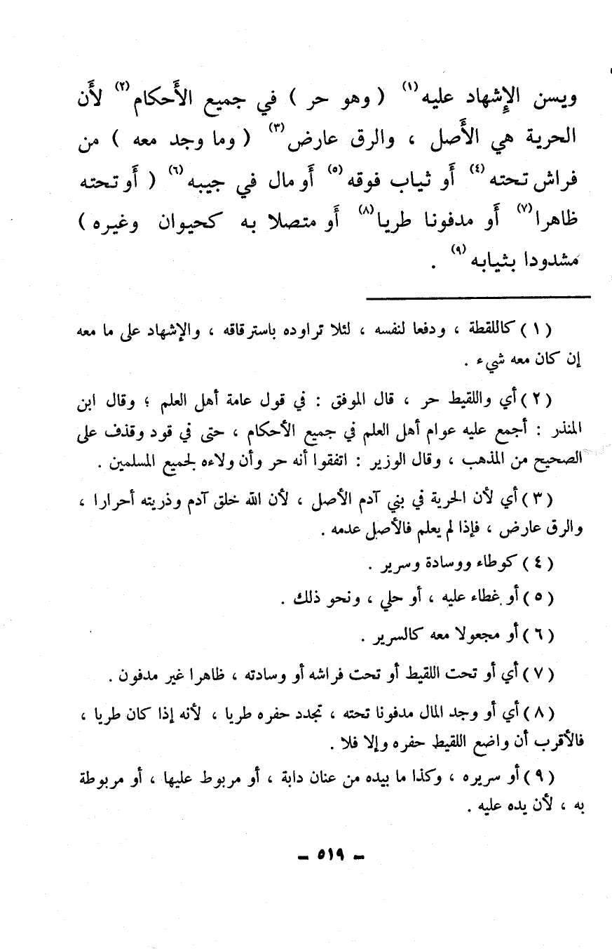 ويسن الإشهاد عليه (¬1) (وهو حر) في جميع الأحكام (¬2) لأن الحرية هي الأصل، والرق عارض (¬3) (وما وجد معه) من فراش تحته (¬4) أو ثياب فوقه (¬5) أو مال في جيبه (¬6) (أو تحته ظاهرًا (¬7) أو مدفونًا طريا (¬8) أو متصلاً به كحيوان وغيره) مشدودا بثيابه (¬9) .