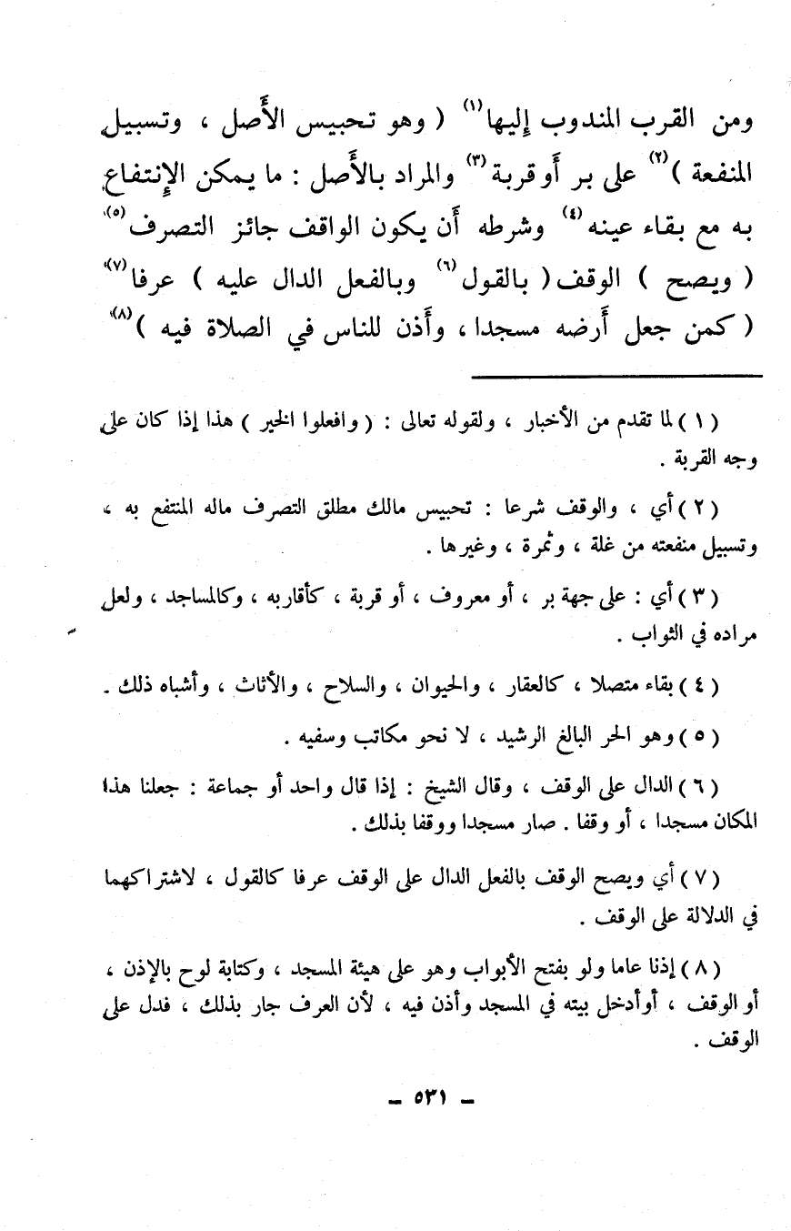 ومن القرب المندوب إليها (¬1) (وهو تحبيس الأصل، وتسبيل المنفعة) (¬2) على بر أو قربة (¬3) والمراد بالأصل: ما يمكن الانتفاع به مع بقاء عينه (¬4) وشرطه أن يكون الواقف جائز التصرف (¬5) (ويصح) الوقف (بالقول (¬6) وبالفعل الدال عليه) عرفا (¬7) (كمن جعل أرضه مسجدا، وأذن للناس في الصلاة فيه) (¬8)