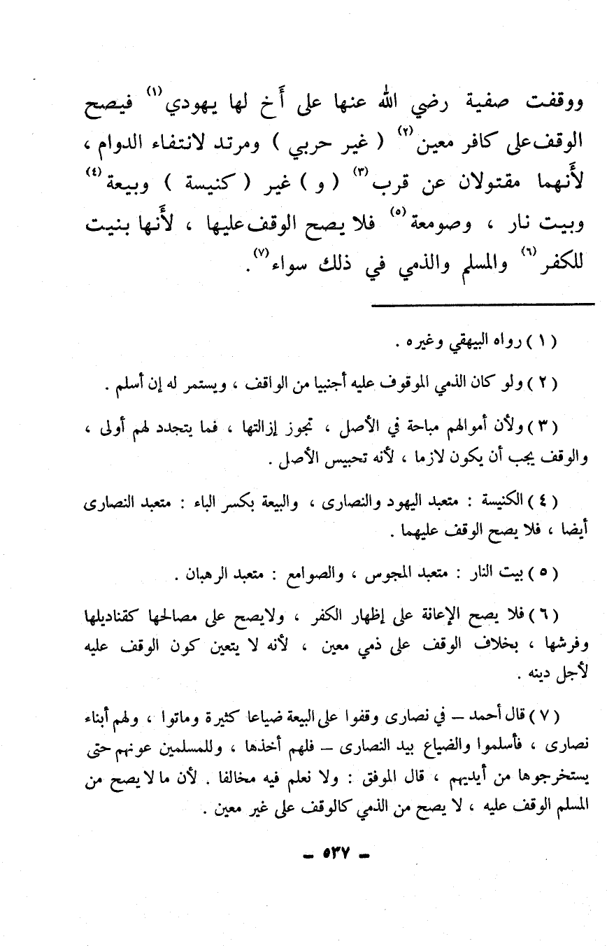 ووقفت صفية رضي الله عنها على أخ لها يهودي (¬1) فيصح الوقف على كافر معين (¬2) (غير حربي) ومرتد لانتفاء الدوام، لأنهما مقتولان عن قرب (¬3) (و) غير (كنيسة) وبيعة (¬4) وبيت نار، وصومعة (¬5) فلا يصح الوقف عليها، لأنها بنيت للكفر (¬6) والمسلم والذمي في ذلك سواء (¬7) .