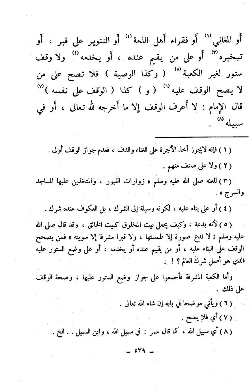 (¬5) لأنه بدعة، وكيف يجعل بيت المخلوق كبيت الخالق، وقد قال صلى الله عليه وسلم «لا تدع صورة إلا طمستها، ولا قبرا مشرفًا إلا سويته» فمن يصحح الوقف على البناء عليه، أو من يقيم عنده أو يخدمه، أو على وضع الستور عليه الذي هو أصل شرك العالم؟!.