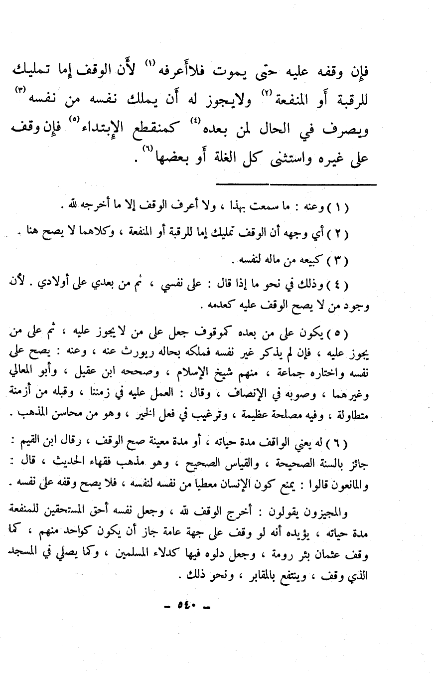 (¬5) يكون على من بعده كموقوف جعل على من لا يجوز عليه، ثم على من يجوز عليه، فإن لم يذكر غير نفسه فملكه بحاله ويورث عنه، وعنه: يصح على نفسه واختاره جماعة، منهم شيخ الإسلام، وصححه ابن عقيل، وأبو المعالي وغيرهما، وصوبه في الإنصاف، وقال: العمل عليه في زمننا، وقبله من أزمنة متطاولة، وفيه مصلحة عظيمة، وترغيب في فعل الخير، وهو من محاسن المذهب.