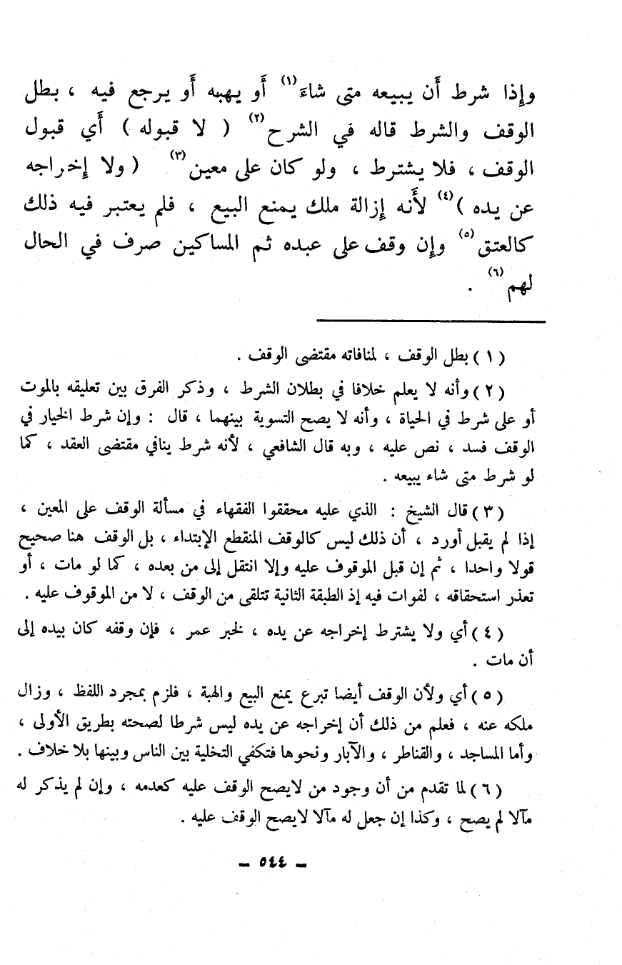 وإذا شرط أن يبيعه متى شاء (¬1) أو يهبه أو يرجع فيه، بطل الوقف والشرط قاله في الشرح (¬2) (لا قبوله) أي قبول الوقف، فلا يشترط، ولو كان على معين (¬3) (ولا إخراجه عن يده) (¬4) لأنه إزالة ملك يمنع البيع، فلم يعتبر فيه ذلك كالعتق (¬5) وإن وقف على عبده ثم المساكين صرف في الحال لهم (¬6) .